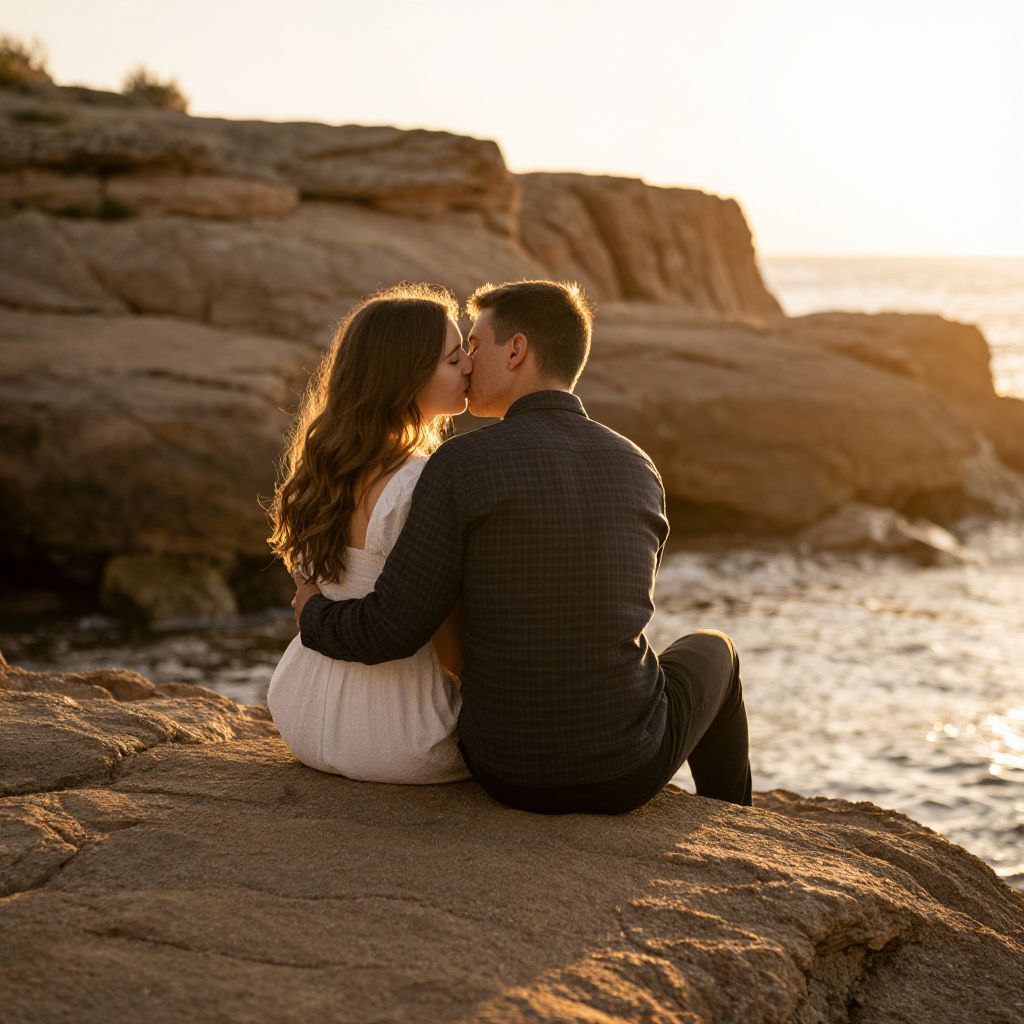 A warm, golden sunset photograph of a couple sitting on a rocky shoreline. The woman with long, wavy brown hair wears a white dress, while the man with short dark hair is in a dark, checkered shirt and black pants. They are close, sharing a tender kiss. The sun casts a soft glow over the rocky, textured background, with gentle reflections in the water.