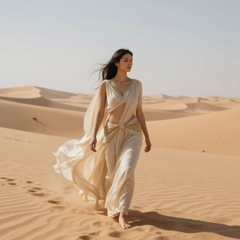 Photograph of a young woman with long, dark hair walking barefoot in a sunlit desert. She wears a flowing, sheer, cream-colored, draped outfit that reveals her midriff and billows in the wind. The desert sand is golden and rippled, with soft, dune-like formations in the background under a clear, pale blue sky. Her serene expression and relaxed posture contrast with the stark, arid environment, creating a sense of calm and movement. The sunlight casts gentle shadows, enhancing the texture of the sand and her outfit.