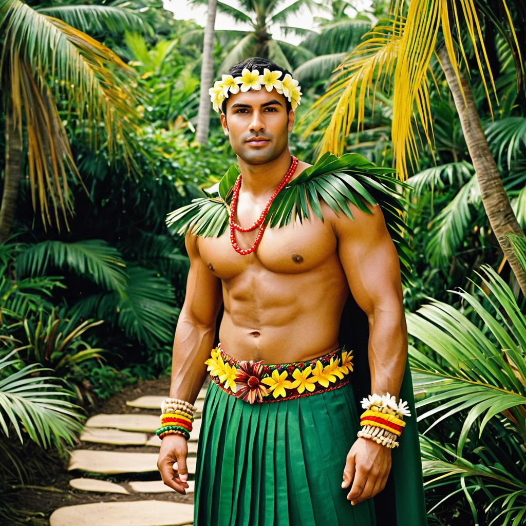 Photograph of a handsome young Polynesian man with a muscular build, dressed in traditional hula attire. He wears a green leafy shoulder cape, a green pleated skirt with a red and yellow cord belt adorned with flowers, and multiple colorful bead bracelets on both wrists. A flower headband with yellow and white plumeria flowers decorates his head. He stands confidently in a lush tropical jungle setting with palm trees and sunlight filtering through the leaves. The image captures vibrant colors and natural light, emphasizing traditional Polynesian cultural attire.