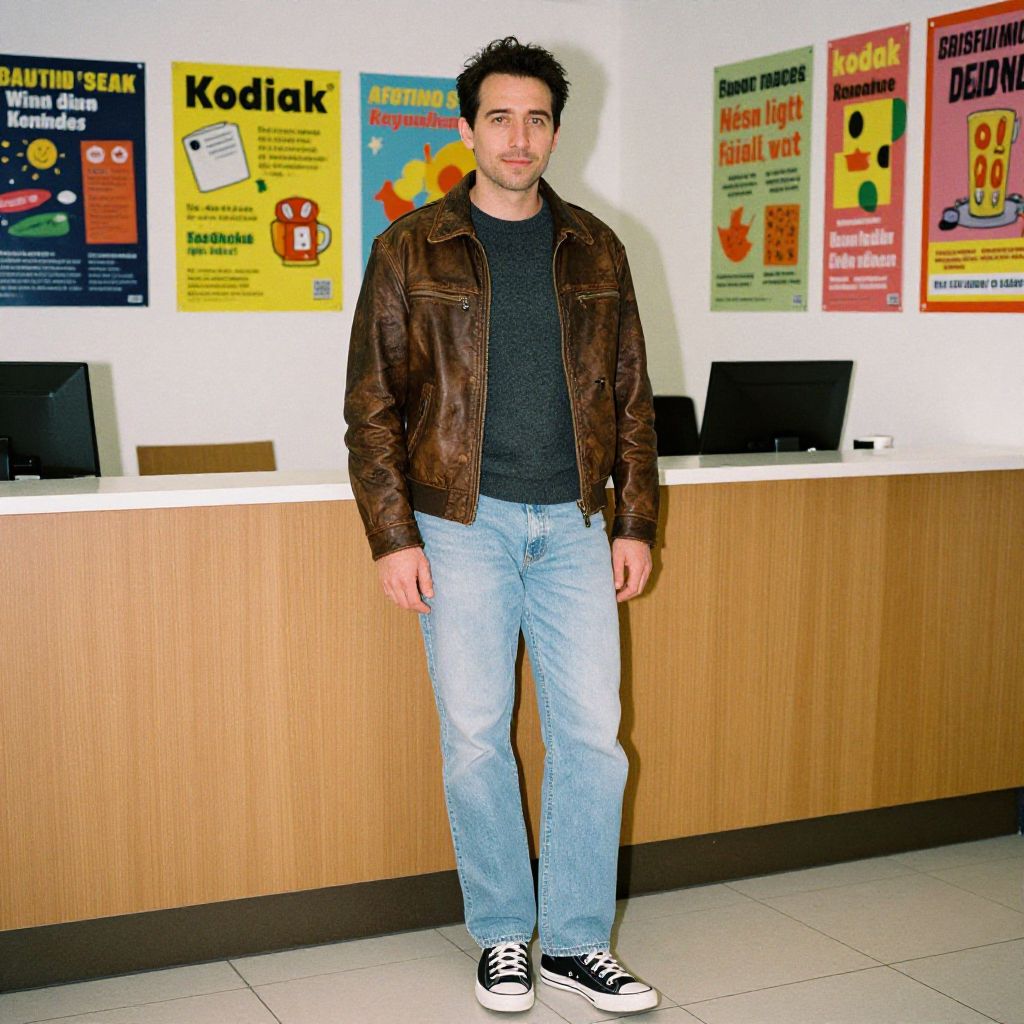 A man, brown distressed leather jacket, charcoal grey crew neck sweater, light wash straight-leg jeans, black high-top sneakers, brightly lit reception area, colorful resource posters on walls, relaxed weekend vibe, soft smile, kodak sp analog photo. Man has masculine face and piercing eyes