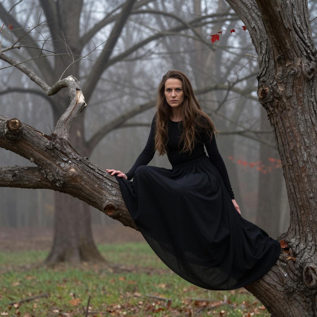 Photograph of a woman with long brown hair sitting on a large, twisted tree branch. She wears a black long-sleeve top and a long, black, flowing skirt that drapes over the branch. Background features a foggy forest with bare trees and scattered red leaves. Her expression is intense and focused. The tree is dark brown with rough bark, and the forest floor is covered in green grass and fallen leaves.