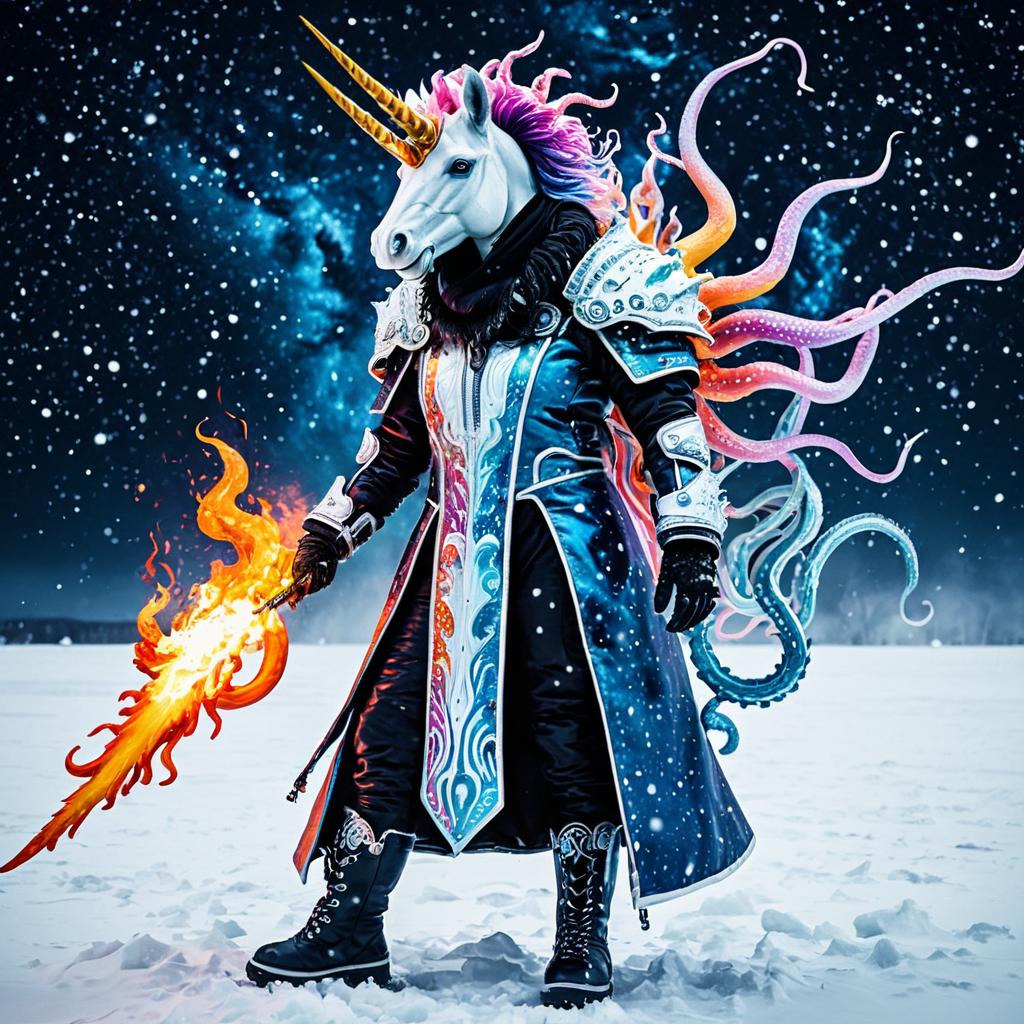 Full-body fantasy character featuring a humanoid figure with a unicorn head with golden horns and fiery pink mane. The figure is dressed in detailed, tight ice-space squid armor with mechanical and tentacle elements, layered under a long, dark hallucinatory snow coat. The scene is set in a snowy landscape under a starry sky, combining themes of fire and ice with a neo-fauvist art style inspired by Lisa Frank. The character holds a fiery sword that contrasts with the cold surroundings.