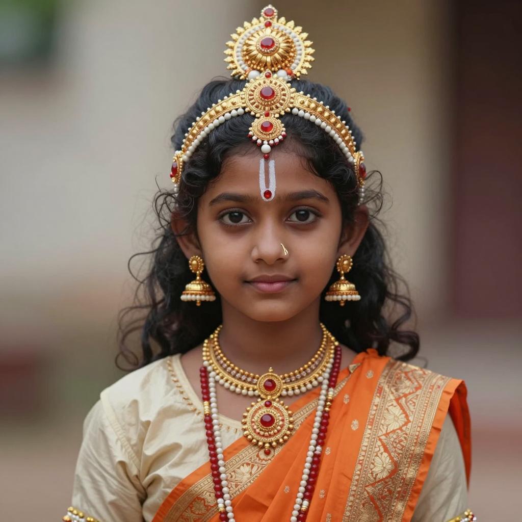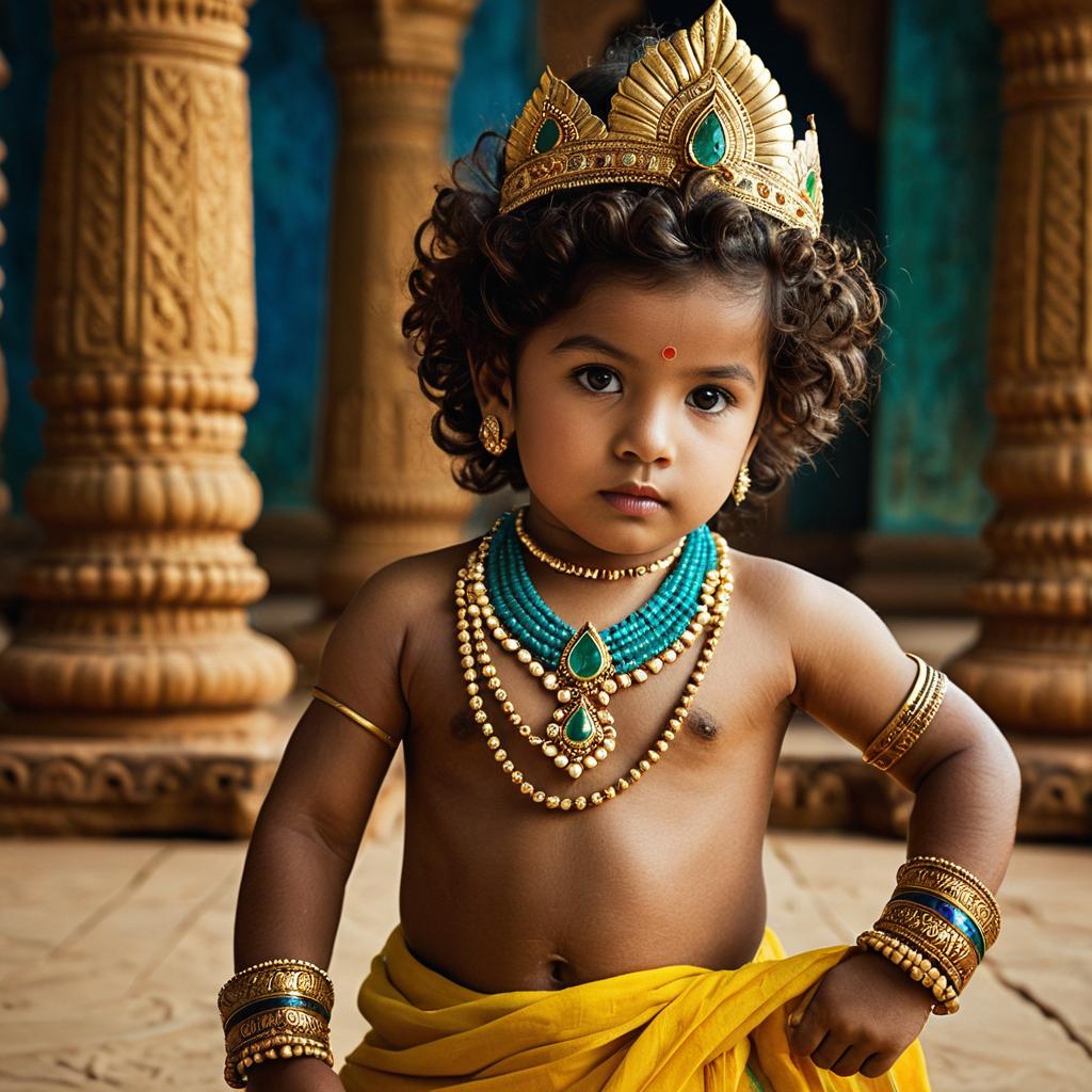 Baby radha krishna male, photograph of young Indian man, traditional attire, gold and red turban with sunburst design, white and red shirt with gold patterns, gold chain necklace, black curly hair, brown skin, brown eyes, serious expression, blurred beige background, cultural clothing, traditional jewelry, symmetrical composition, portrait, detailed ures, soft lighting, realistic style, intricate designs, elegant, traditional Indian dress, ethnic fashion