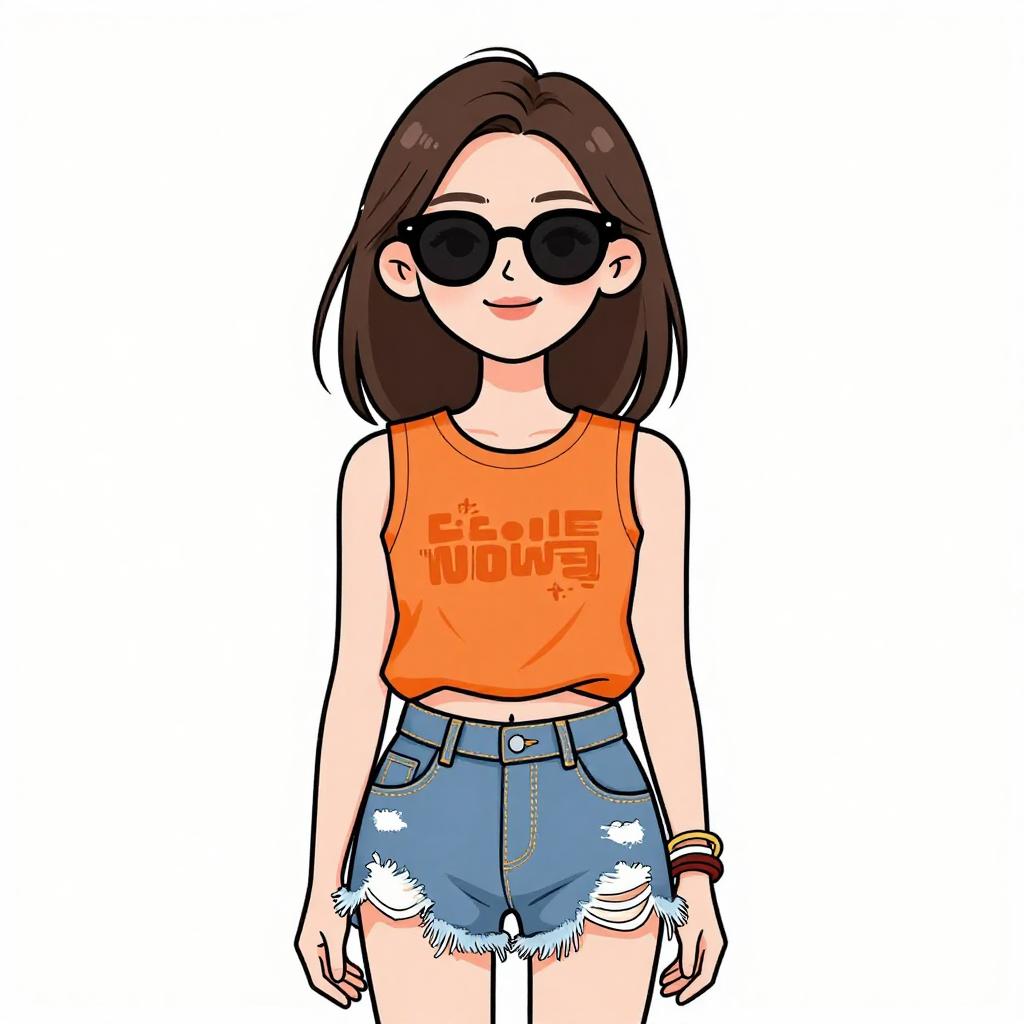 Digital illustration of a young woman with brown hair, wearing black sunglasses, an orange "Best Wishes" tank top, and frayed denim shorts,
