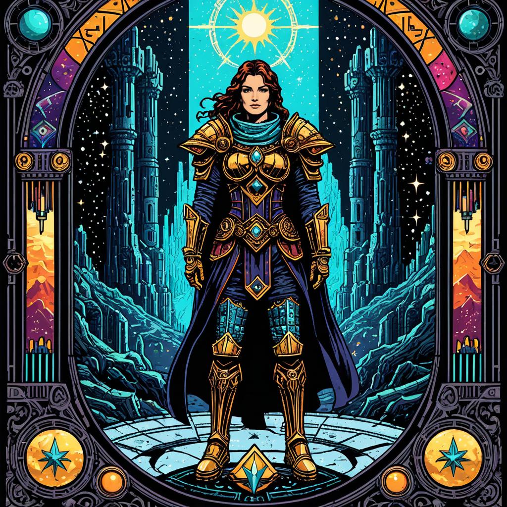 Tarot card style, set in a celestial dreamscape in EGA pixel art from the 1990s. Illustrated by Stanley Rosewood, with full colors and a surreal, mysterious fantasy atmosphere. The artwork is a detailed masterpiece in portrait orientation, featuring a cosmic oracle, with intricate dithering, anti-aliasing, and CRT screen effects for a vintage look. Bit-depth and pompous composition inspired by Alphonse Mucha, blending pixel art with ornate, fantastical details.
