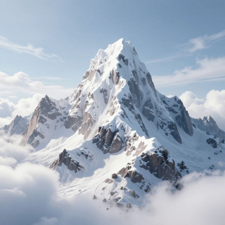 A majestic, snow-covered mountain rendered in a high-definition 3D style pierces through a serene sky, where ethereal clouds drift gracefully, evoking a surreal, otherworldly atmosphere reminiscent of a digital fantasy landscape.