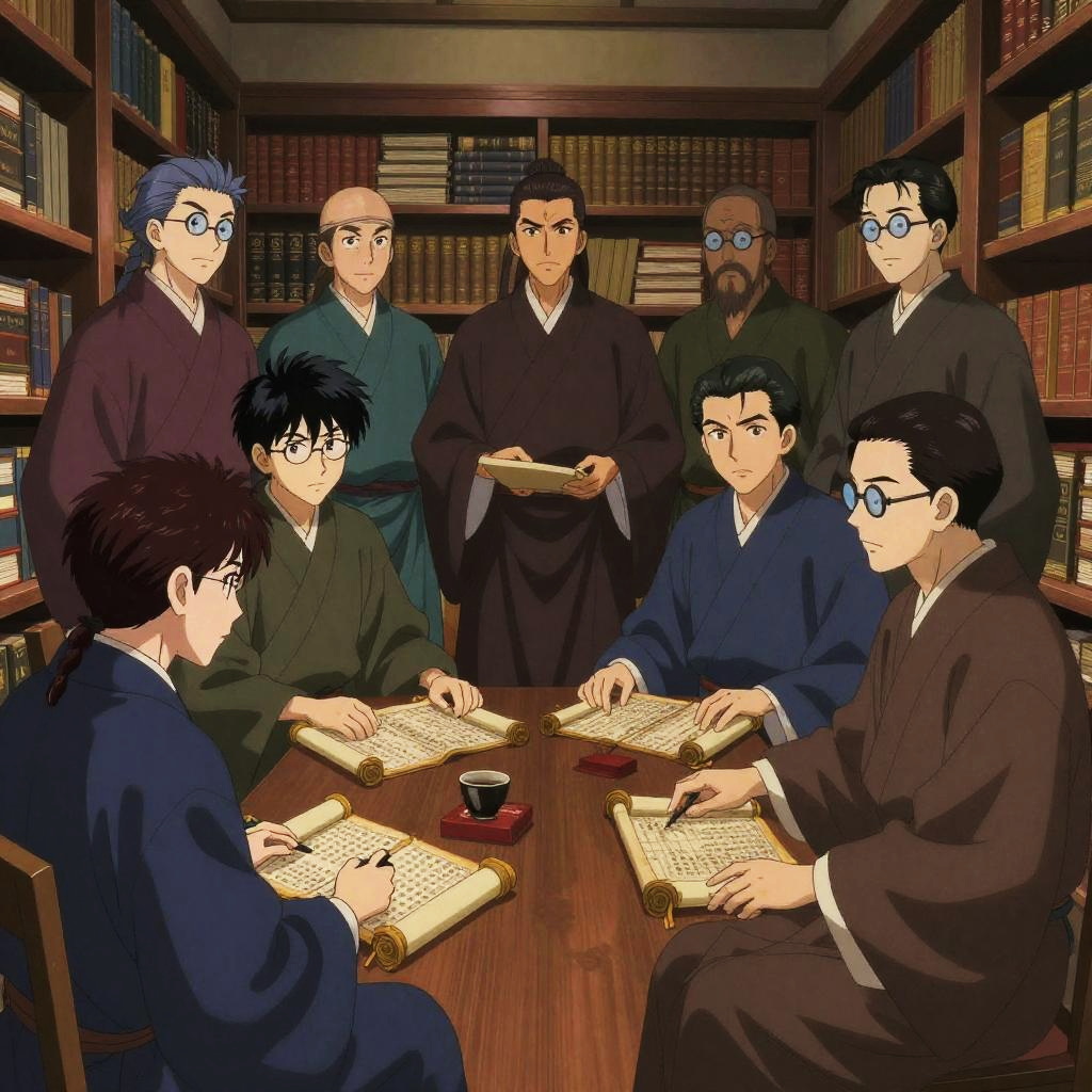 Realistic photo.a group of scholars, wearing long robes and spectacles, performing a discussion over ancient scrolls, set in an ornate library filled with books, depicted in the historical and dramatic anime style of Makoto Yukimura. realistic photo