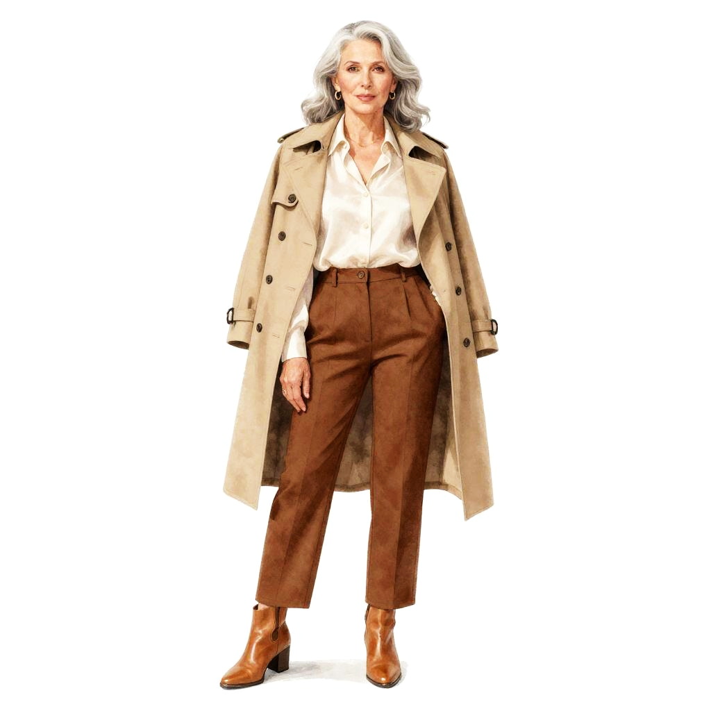 Middle-aged Woman, Athletic, Shoulder-length wavy silver hair, brown pants outfit, tailored brown wool trousers with a cream silk blouse, camel trench coat draped over shoulders, tan leather ankle boots, soft watercolor hues