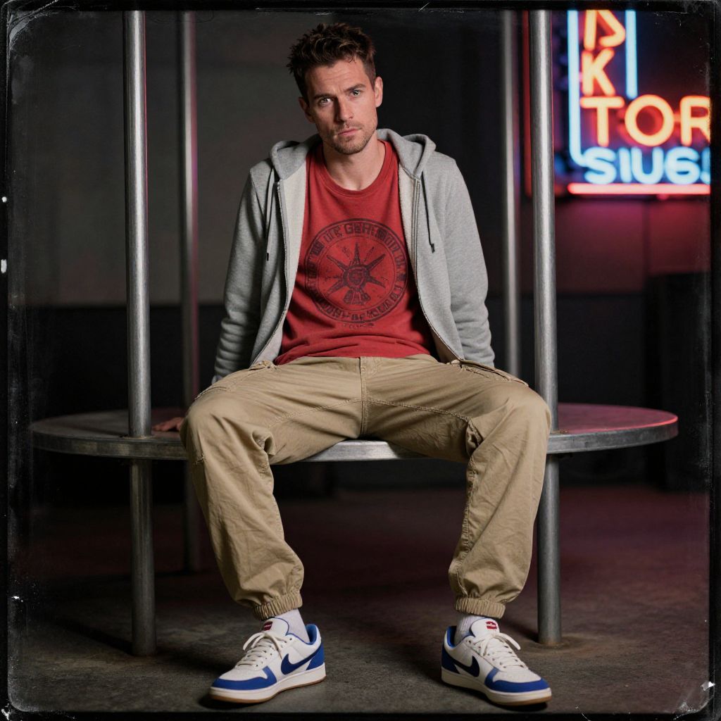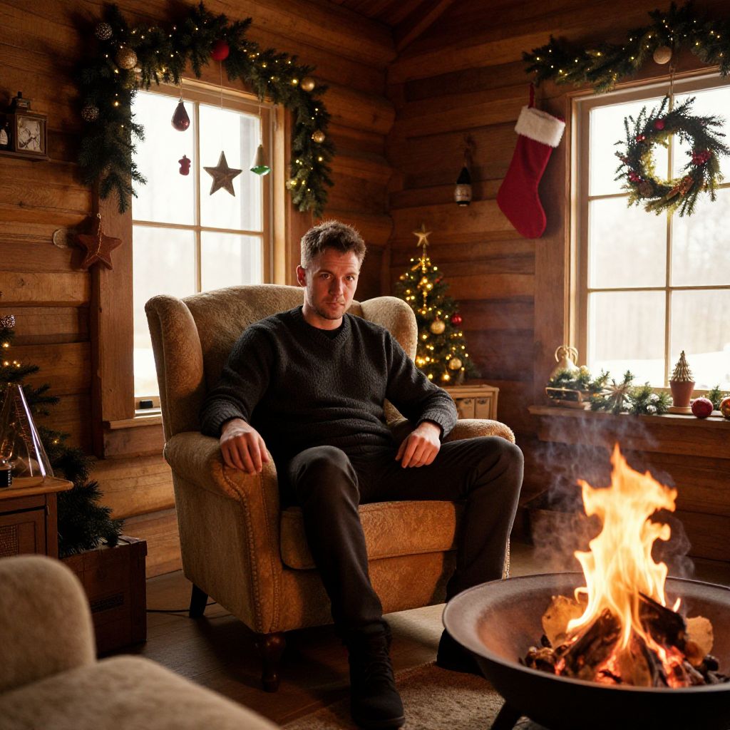A man, snow shoes, all-terrain grip, dark gray outfit, cozy porch swing, rustic stone walls, twinkling fairy lights, collodion wet plate style, contemplative expression. Man has masculine face and piercing eyes