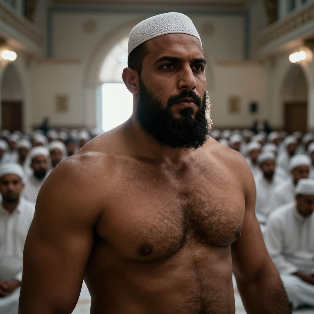 Photograph of a muscular, bearded Middle Eastern man with a white cap, shirtless, standing in a mosque filled with men wearing white caps and