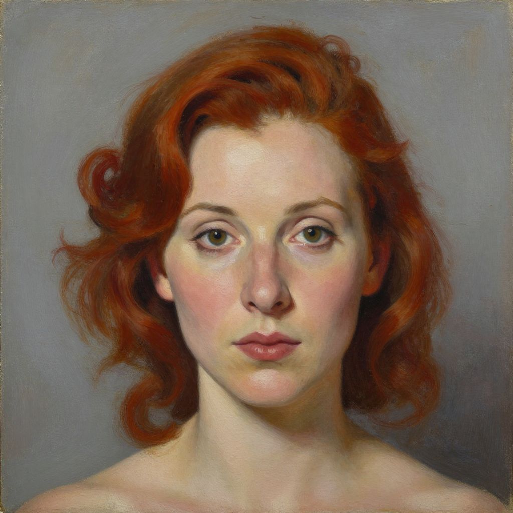 Realistic oil painting of a fair-skinned woman with red curly hair, green eyes, and pink lips, looking directly at the viewer.