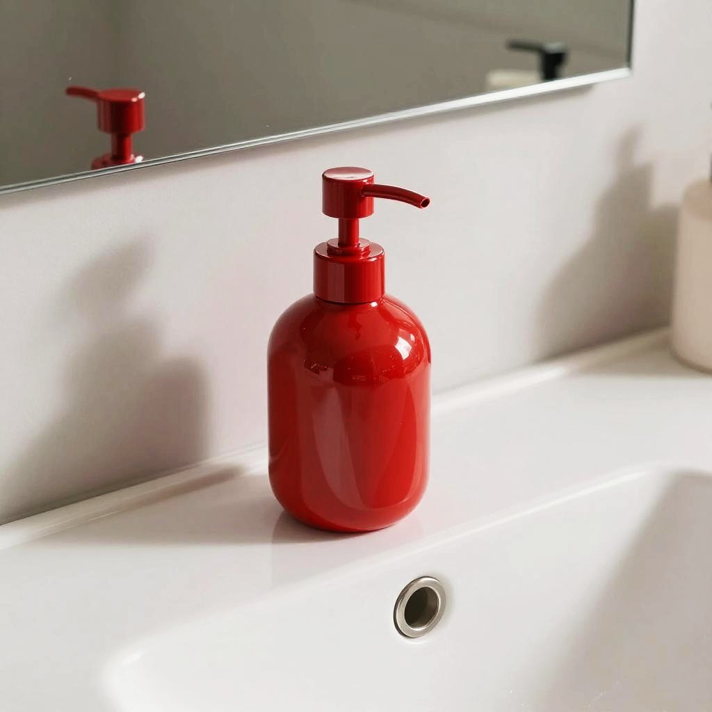 Red soap dispenser on a sleek modern bathroom sink, glossy finish, minimalistic design, soft natural lighting, clean and inviting atmosphere, high resolution