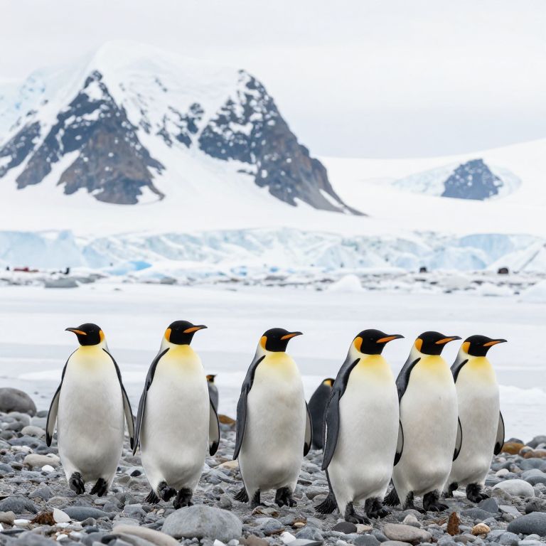 Photograph of six Emperor penguins standing on a rocky, pebble-strewn shore. The penguins have black heads, yellow-orange patches on their necks, and white bellies. They stand in a line with their black flippers by their sides. In the background, there are snow-covered, jagged mountain peaks and a bright, icy blue sea. The sky is overcast, creating a stark contrast with the penguins' vibrant colors and the snowy landscape. The penguins' smooth, sleek feathers contrast with the rough texture of the pebbles beneath their feet.