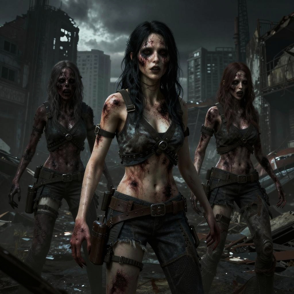 Female horror game characters in post-apocalyptic horror scene, ruined city, terrifying scars, mutated features, dark atmospheric lighting, cinematic angle, highly detailed horror style