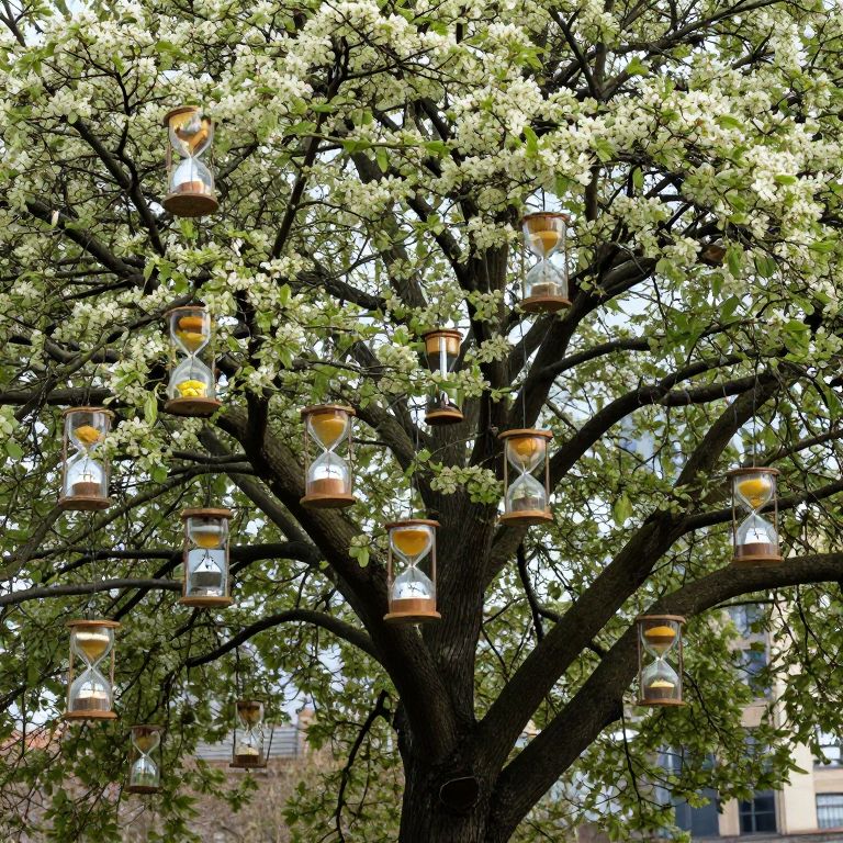A tree of clocks blossoms with hourglasses instead of leaves, each one measuring different universes as time drips backwards in reverse.