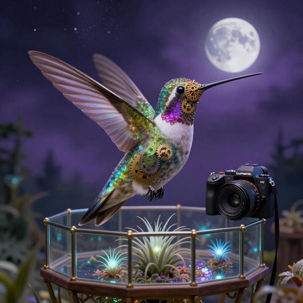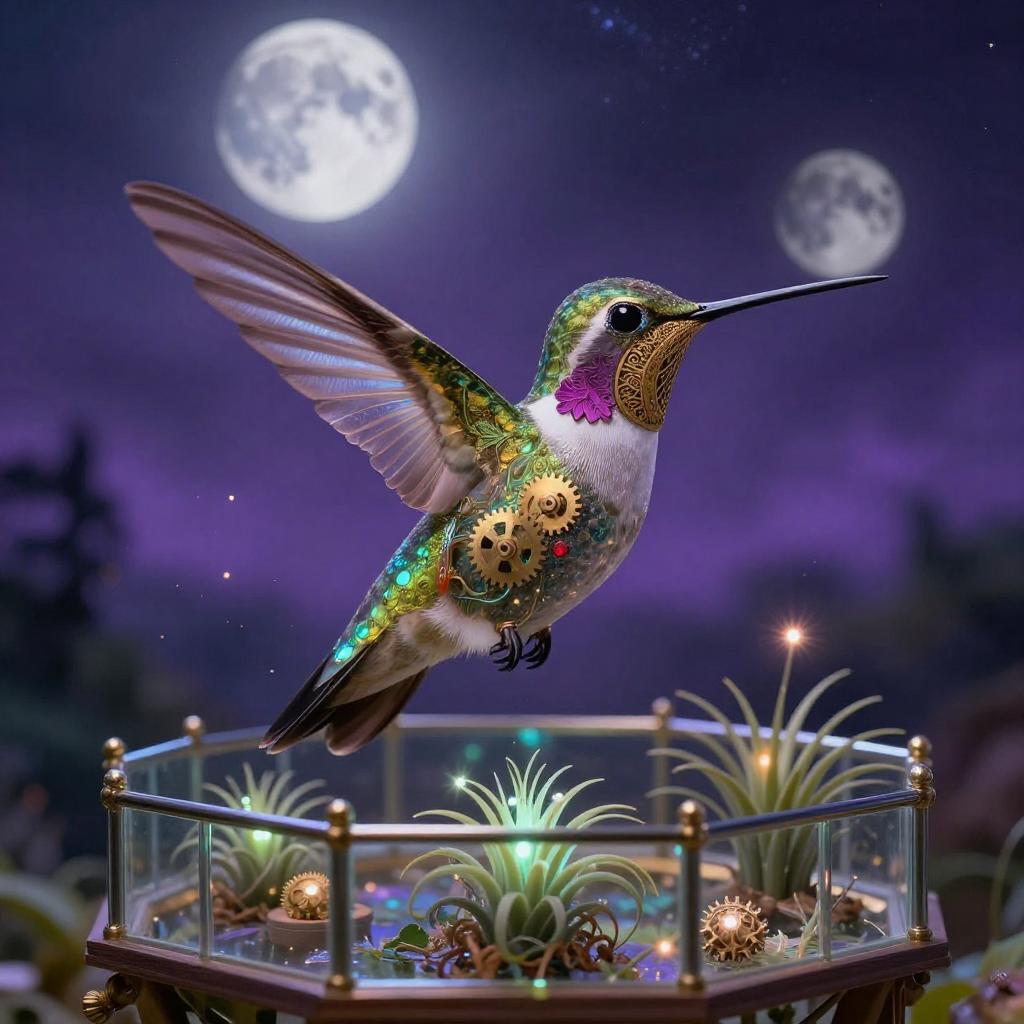 Celestial glass-winged clockwork hummingbird oracle — filament-laced wings, micro-gear heart, brass filigree eyeplate perched in levitating glass greenhouse balcony entwined with bioluminescent air-plants and drifting pollen motes, suspended above a violet nebula sea with twin moons. Shot on Panasonic Lumix S1H 6K with 35mm anamorphic lens, hyperdetailed, 8K HDR, dramatic lighting, cinematic atmosphere.