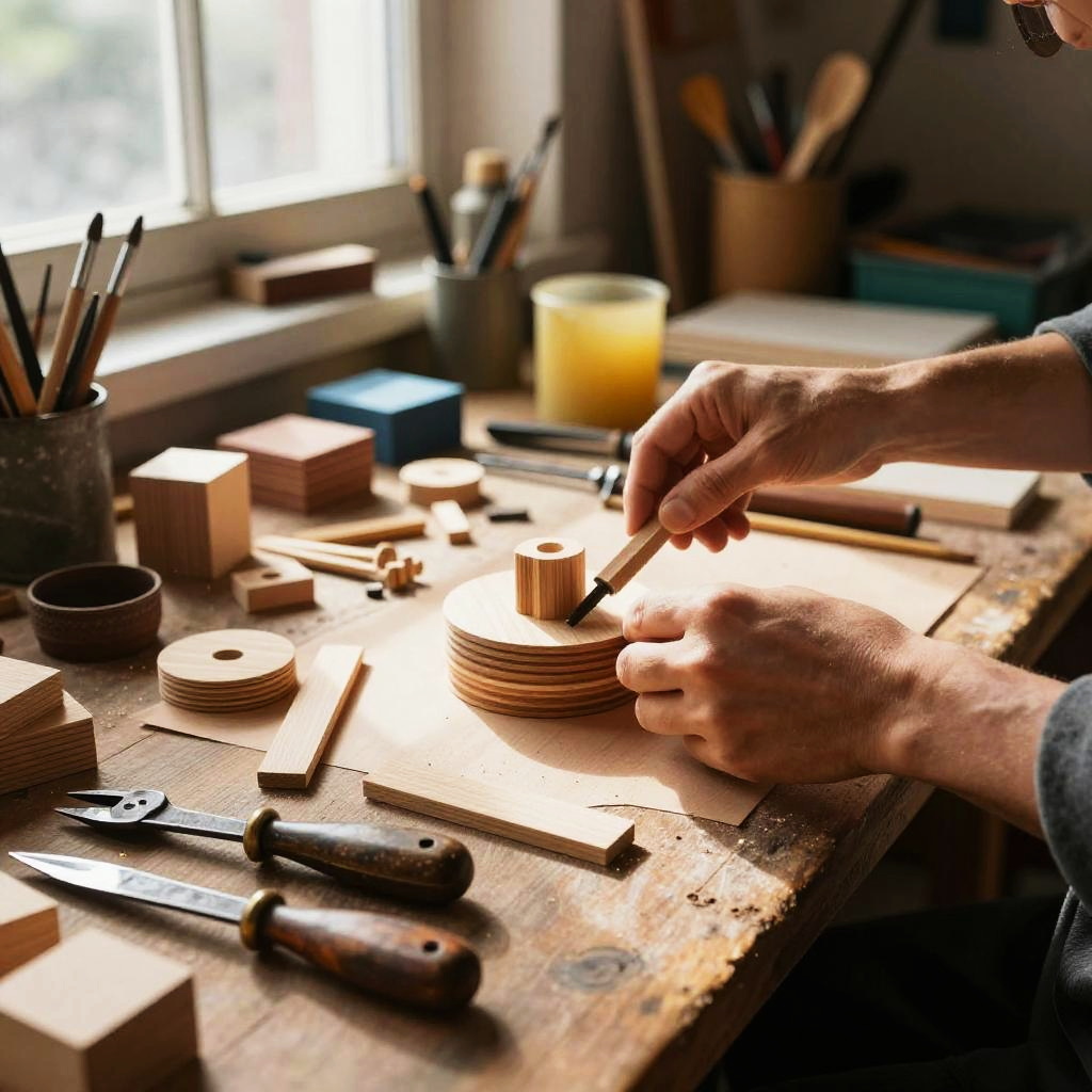 Bricolage scene in a cozy workshop, wooden pieces scattered on a rustic table, warm sunlight filtering through window, hands assembling eclectic handmade objects, vintage tools and colorful materials around, hyper-detailed artistic style.