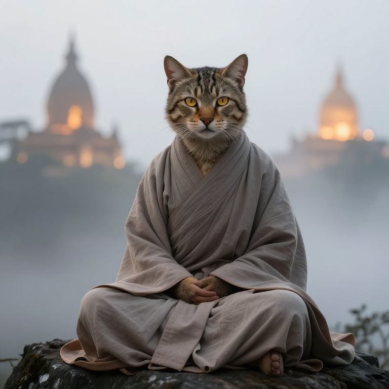 Tabaxi monk female meditating atop a misty mountain peak, feline features soft yet alert, wrapped in simple, flowing monk robes, ancient temples in the background glowing with ethereal light, emphasizing harmony between body and nature with intricate fur patterns and sharp golden eyes.