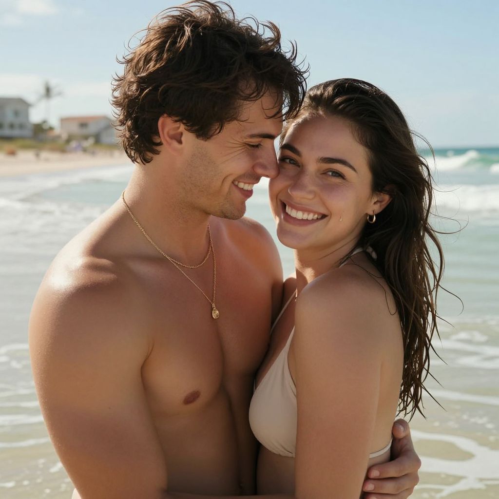 Couple enjoying a sunny beach day, embracing closely with the man wearing a gold necklace and the woman in a beige bikini top, both smiling warmly against a backdrop of gentle waves and distant houses.