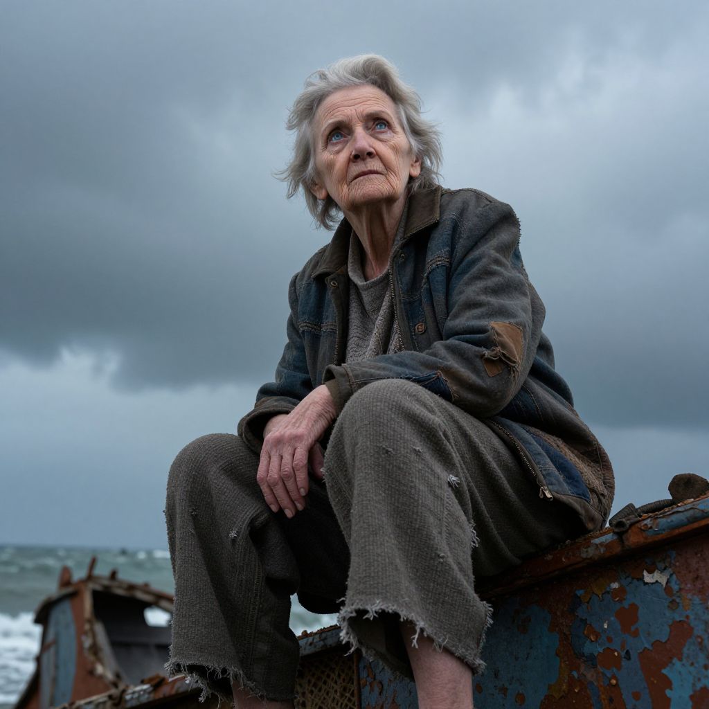 Photograph of an elderly white woman with short, gray, windswept hair, sitting on a rusted boat in a coastal setting. She wears a dark, worn jacket over a gray, tattered shirt and brown, checkered pants with frayed edges. Her expression is solemn, with deep wrinkles and a slight upward tilt of her head. The cloudy, overcast sky adds a somber mood, while the choppy sea is visible in the background. Rusty boat parts and a weathered, blue-and-red painted surface are prominent in the foreground. The image captures a sense of resilience and endurance in an harsh environment.