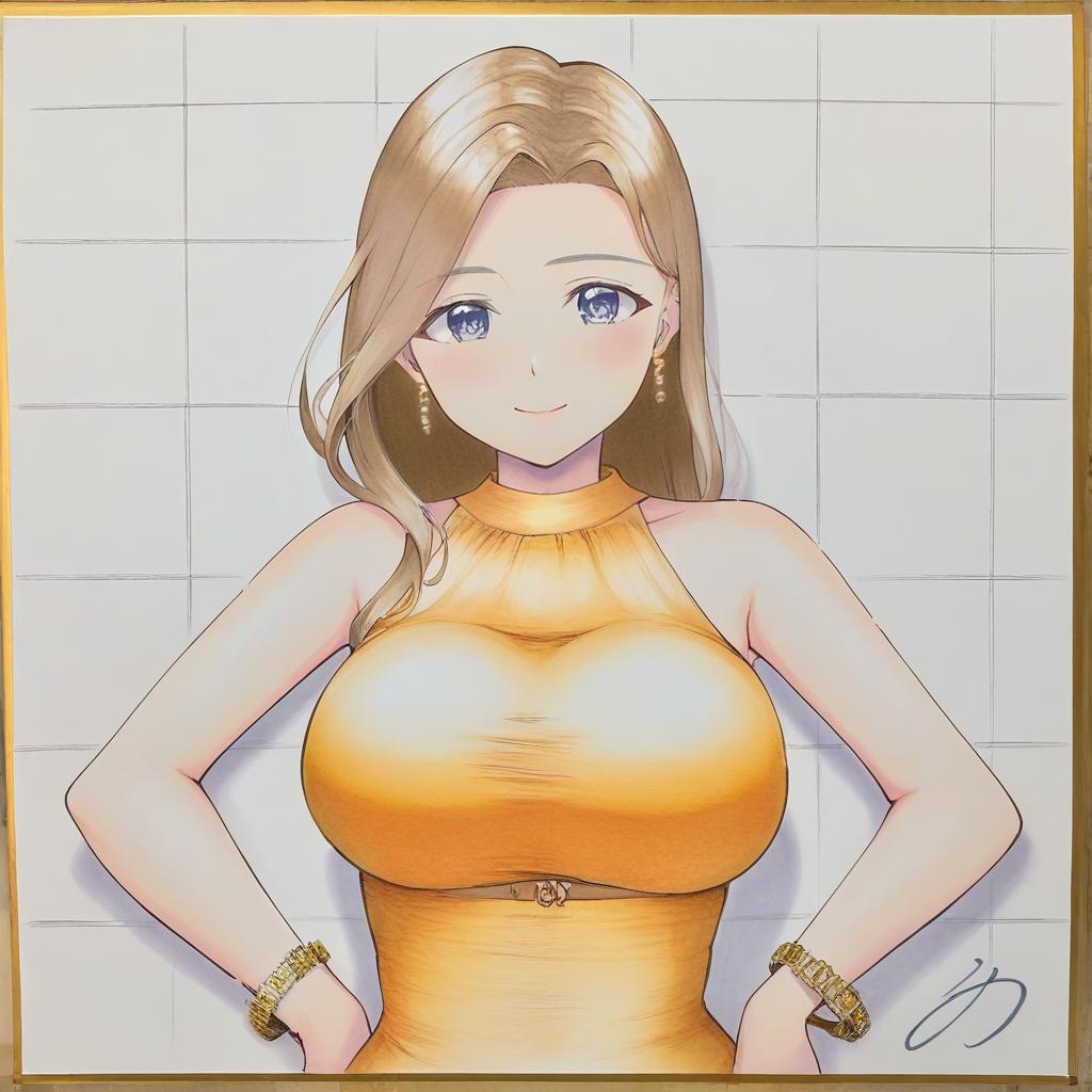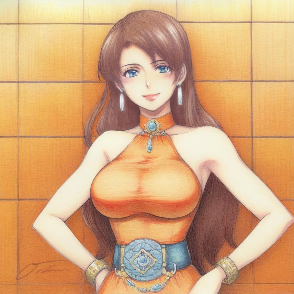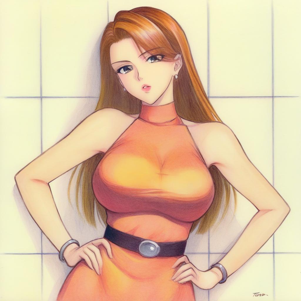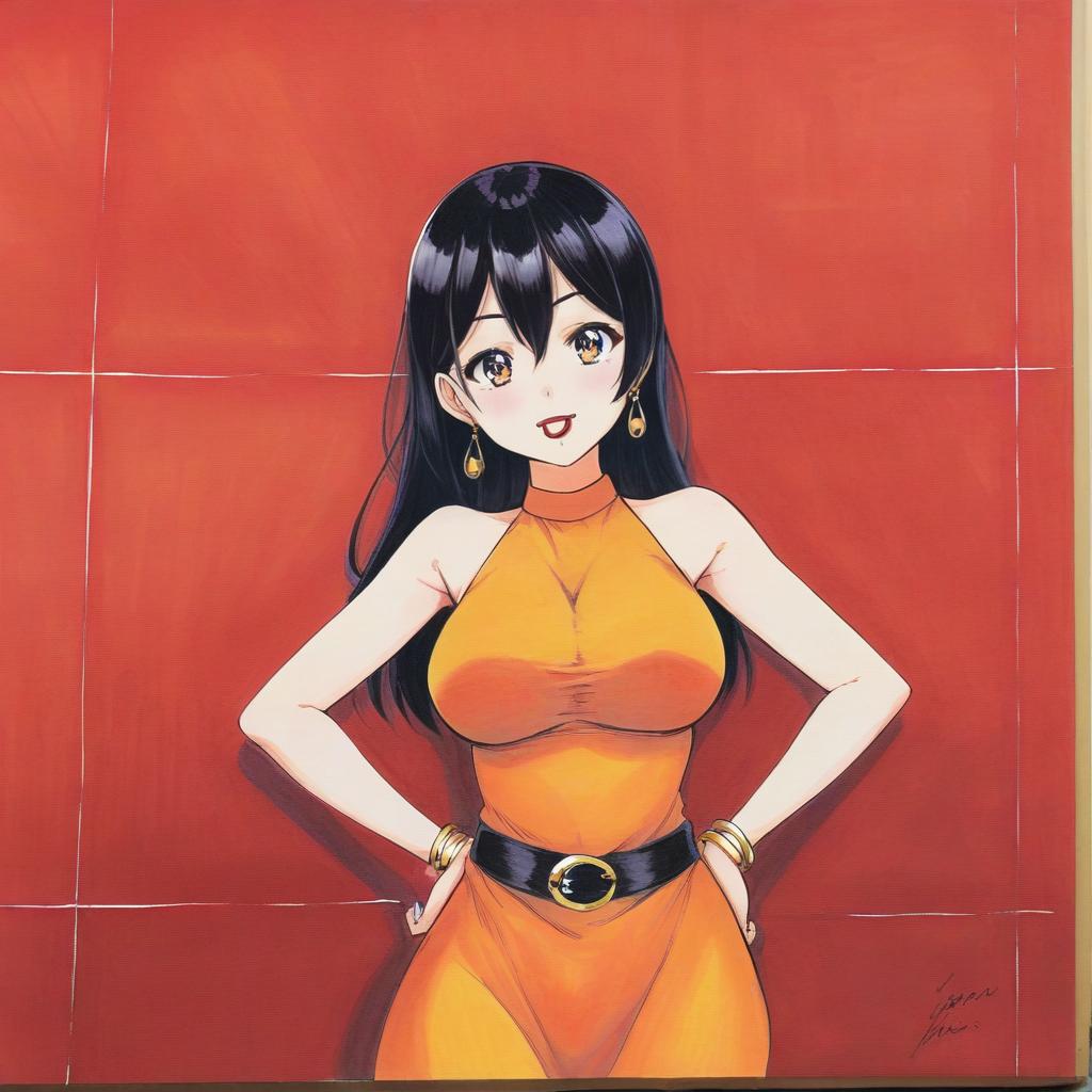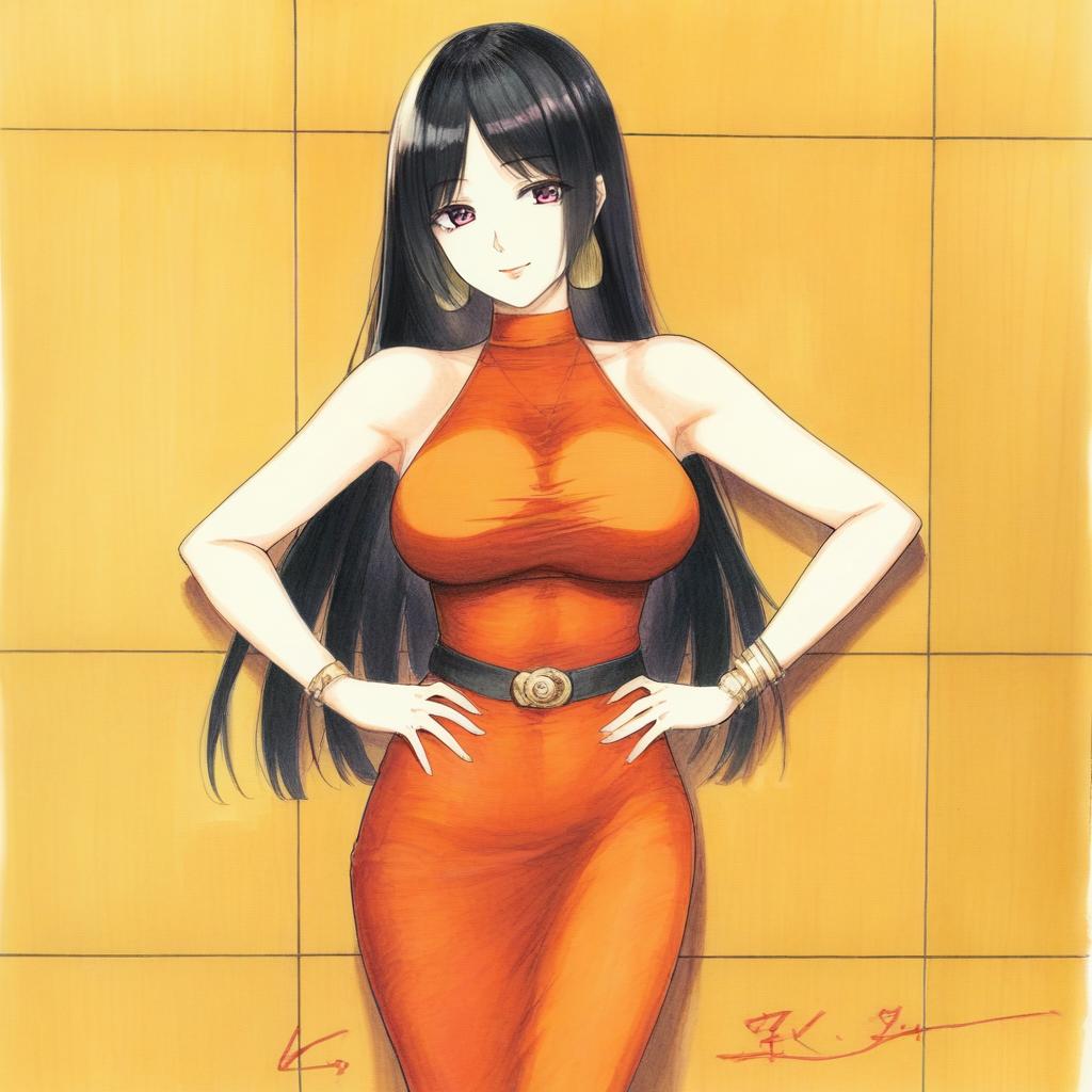 1girl, Megumi Tadokoro, jewelry, dress, hands on own hips, long hair, breasts, earrings, bracelet, traditional media, signature, belt, bare shoulders, large breasts, looking at viewer, sleeveless, orange dress, lipstick, halterneck, makeup, taut clothes, tiles, against wall