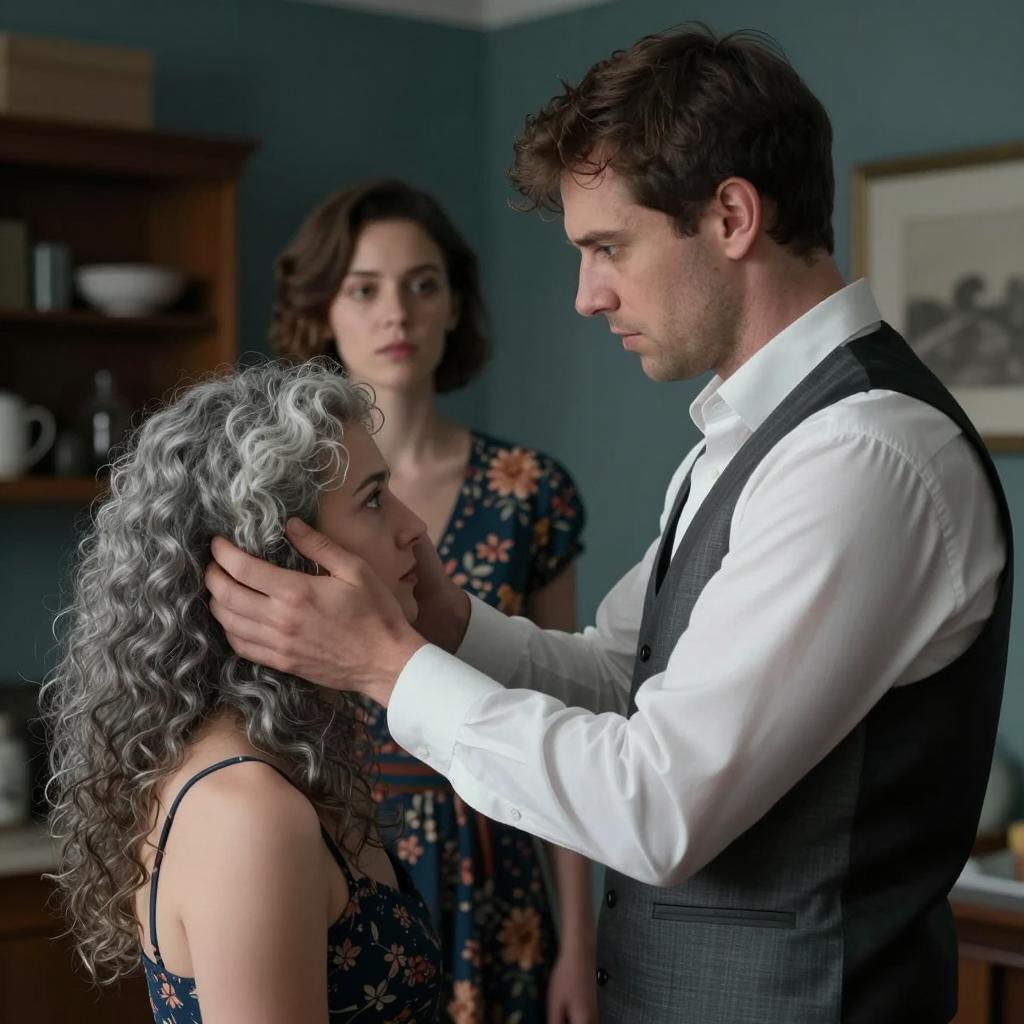 Three people in a dimly lit room. Man in white shirt and vest, gripping a woman's head with long, curly gray hair. Second woman with short brown hair, wearing floral dress, standing behind them. Objects on shelves in background. Blue and green lighting. Man's intense expression. Woman in dress's neutral expression.