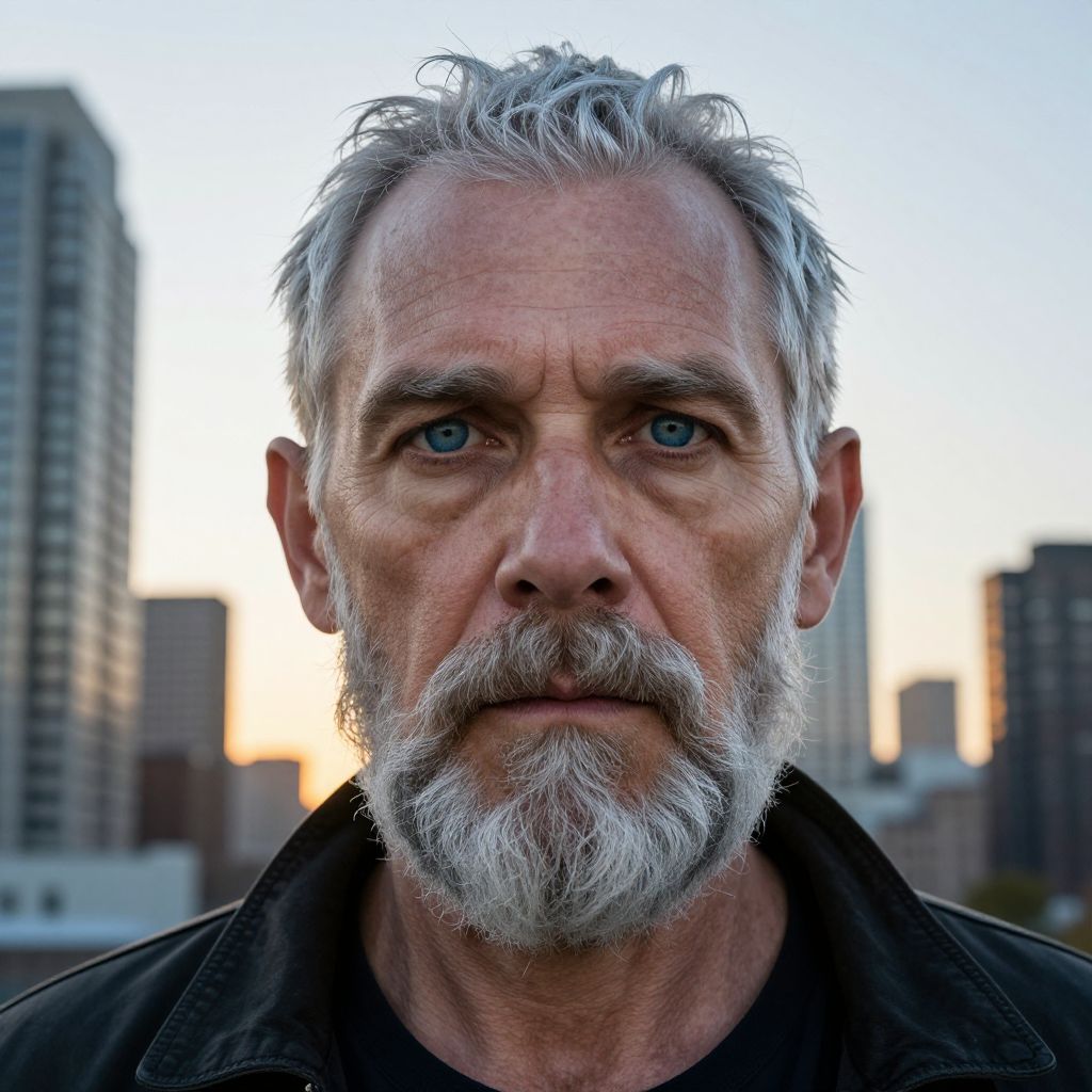 A captivating double exposure portrait showcases an enigmatic man with weathered skin and piercing blue eyes. His gaze, framed by thick silver eyebrows and a full beard, exudes wisdom. The silhouette of this urban dweller blends seamlessly into the towering skyscrapers behind him, softened by the golden hour's ethereal glow. This image captures a profound connection between nature's fleeting moments and humanity's enduring presence in concrete jungles, with cool blues, silvers, and muted grays contrasting warm gold tones from both man and skyline.