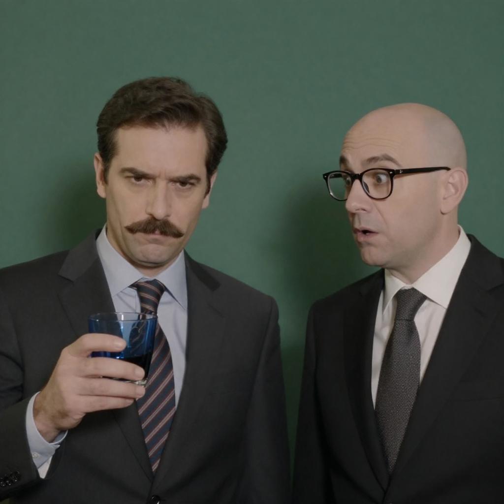 Photograph of two men in suits against a green background. Left man with mustache, dark hair, holding a blue-tinted glass object, serious expression. Right man with glasses, bald, surprised expression, looking at left man. Both wear dark suits and striped ties. Shadows on green background.