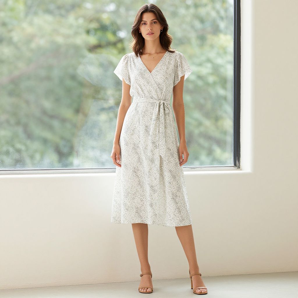 Female model with blonde hair, wearing a beige dress with a button-down front and a pair of sandals on her feet. She is standing in a hallway with a potted plant on the right side.