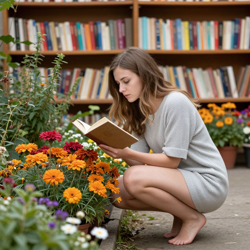 A young woman crouches barefoot among vibrant autumnal flowers, engrossed in reading an open book while surrounded by a lush garden and a backdrop of wooden bookshelves filled with colorful volumes.