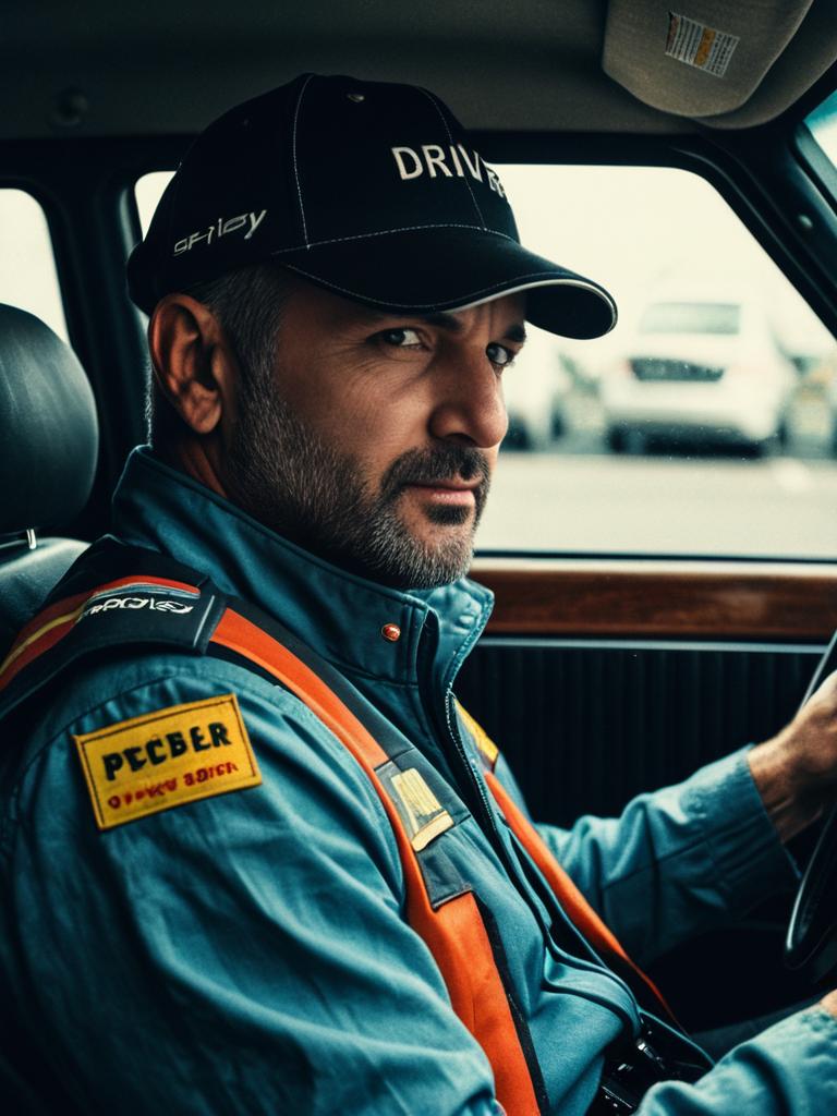 Close-up portrait of a man dressed in a vintage driver or chauffeur uniform, including a cap with a winged insignia and a dark blue jacket with patches on the shoulder. The man is seated inside a vehicle, looking confidently towards the camera. The uniform and vehicle interior suggest a professional or service role.