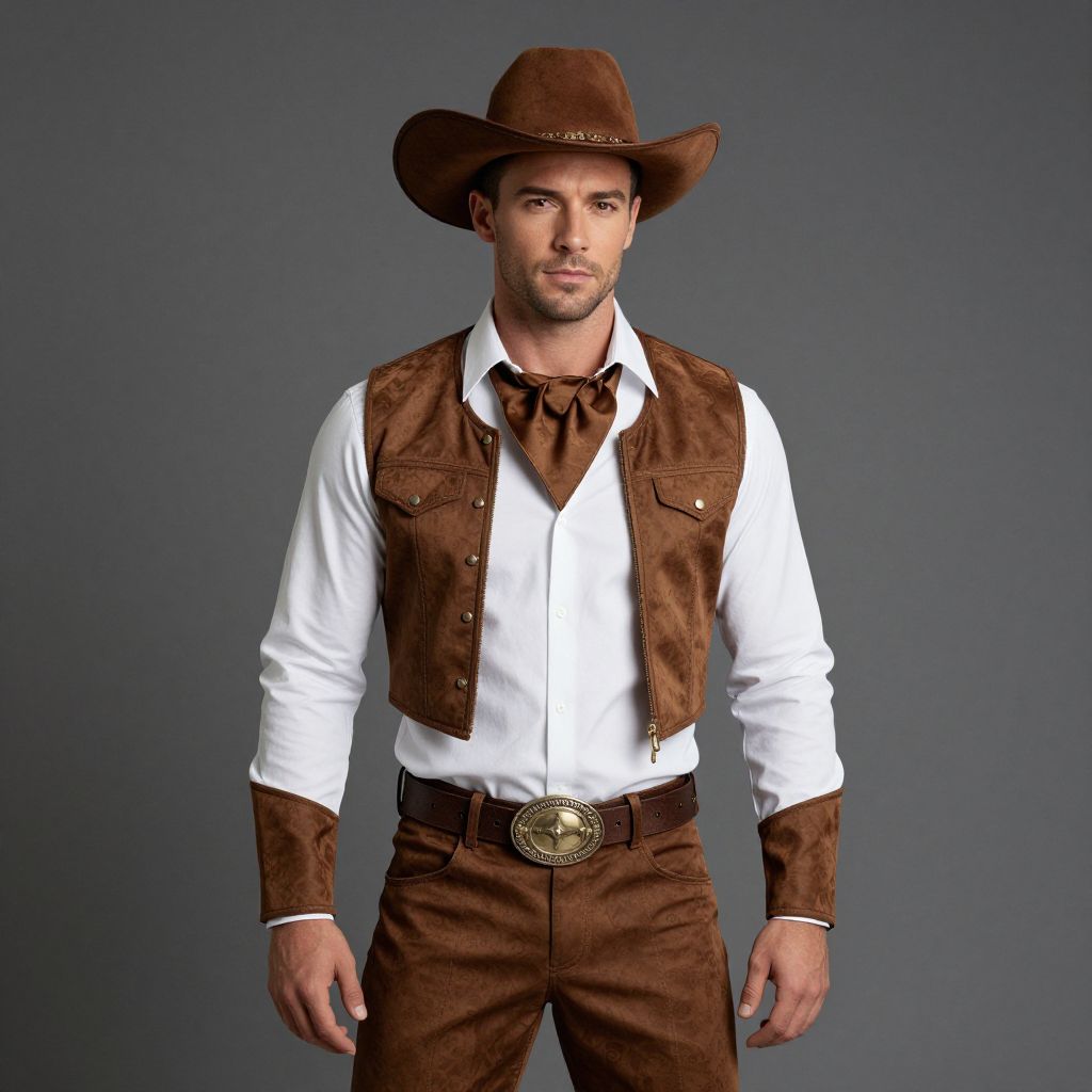 Photograph of a handsome man in a brown cowboy hat, white shirt, brown vest, and pants, with a dark brown belt buckle, standing against