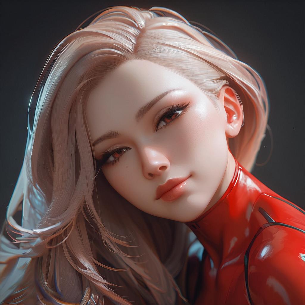 Masterpiece, detailed quality, 1girl, black background, score_9, source_anime, score_8_up, score_7_up, x3dce, 3d, looking at viewer, red bodysuit, skin tight, from side, head tilt back