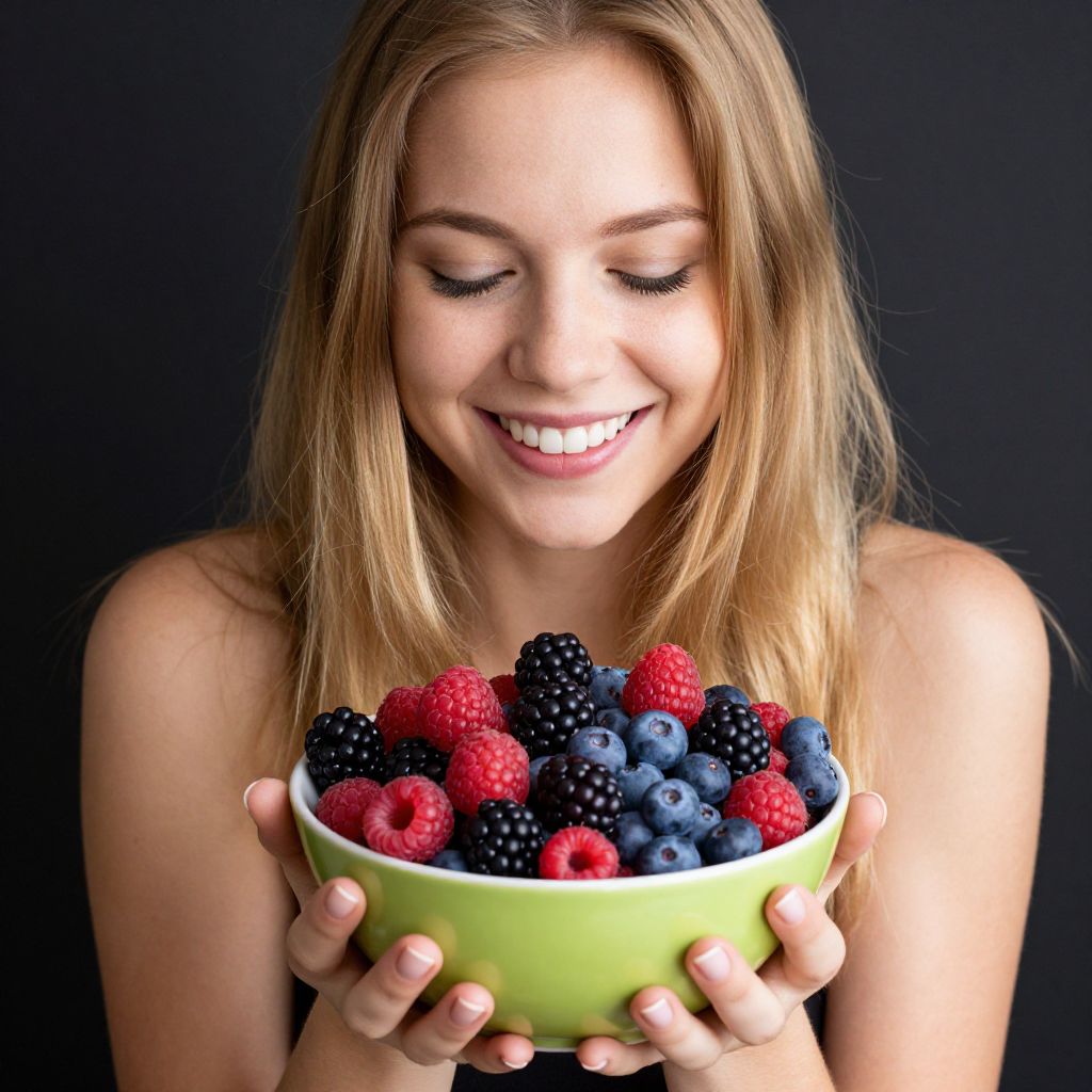Photograph of a smiling, light-skinned, blonde woman with straight hair, holding a green bowl filled with a variety of fresh berries, including raspberries, blackberries, blueberries, and red currants. She is topless, with her shoulders visible, and the dark background contrasts with her fair skin and the vibrant colors of the berries. She looks down at the bowl with a joyful expression, her eyes closed and lips curved in a wide smile. The image is brightly lit, highlighting her features and the textures of the berries.