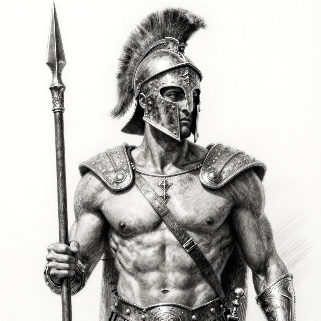 Black-and-white digital drawing of a muscular, armored ancient warrior with a plumed helmet, holding a spear, highlighting detailed armor and defined muscles.
