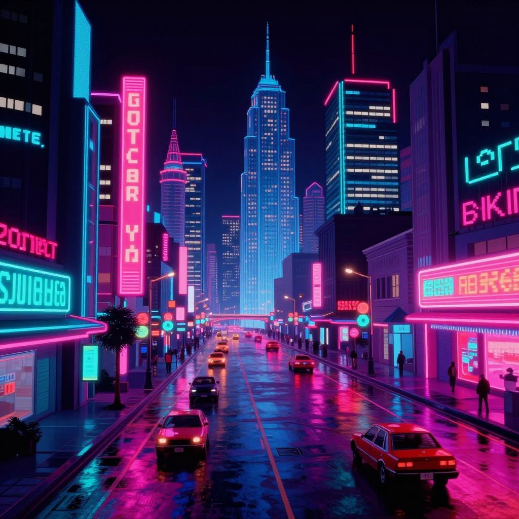 Retro 1980s Neon CGI Cityscape