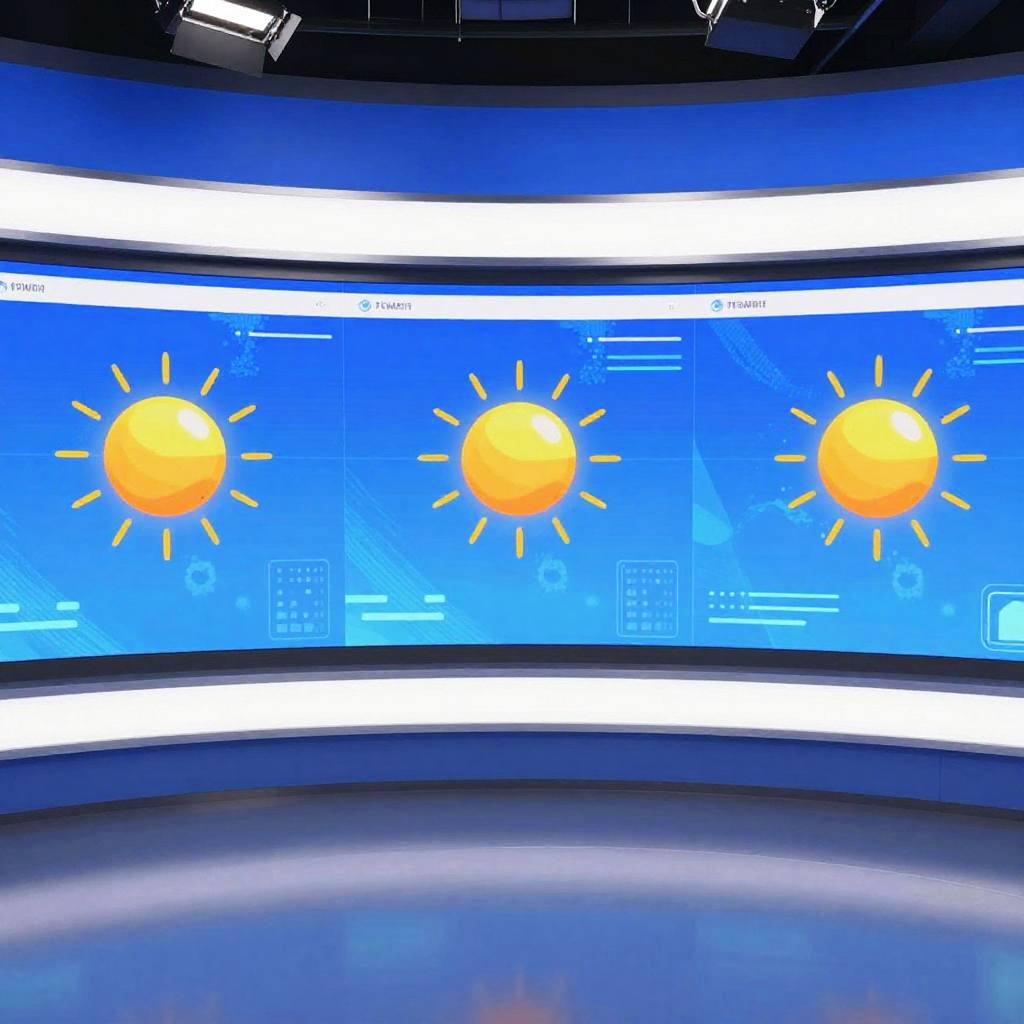 Weather report background, sleek modern news studio with digital screens displaying dynamic weather maps, bright blue and white color scheme, futuristic interface, subtle motion graphics, professional and clean aesthetic, high resolution