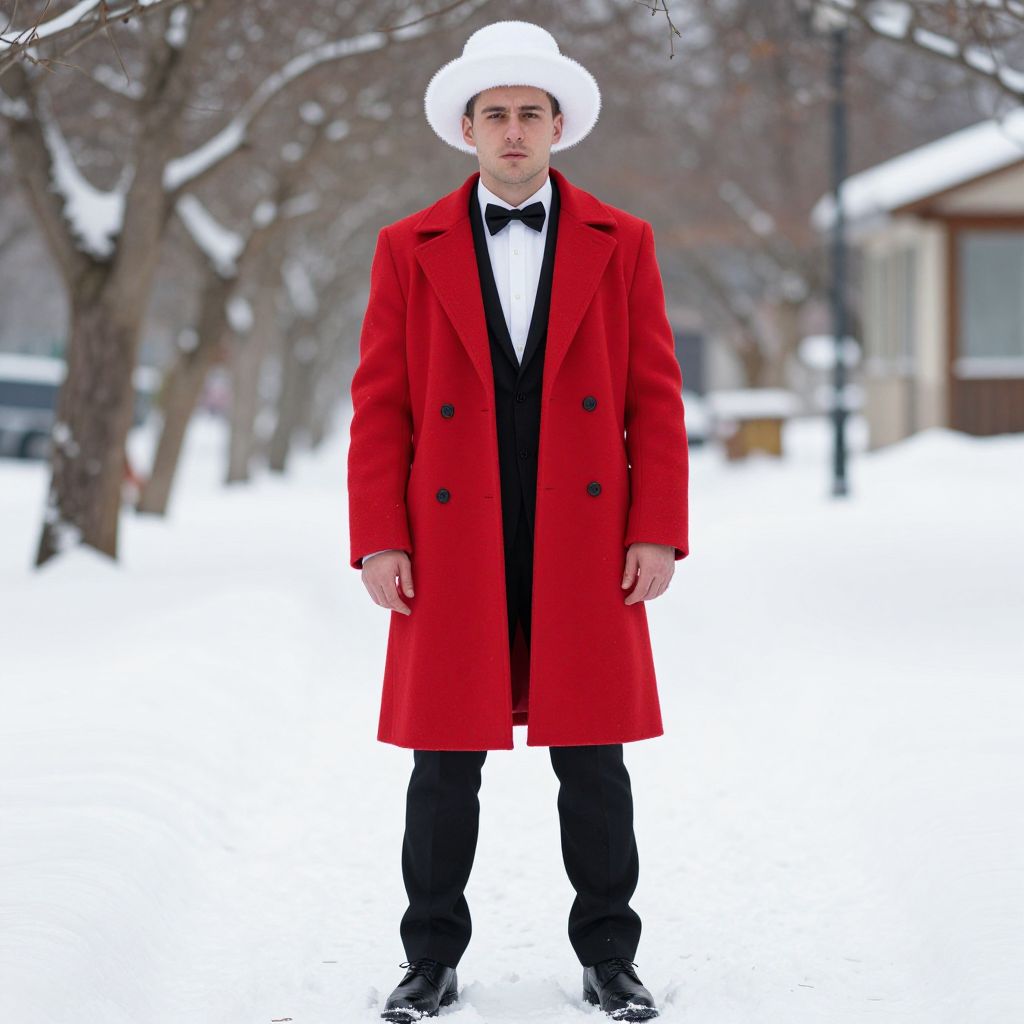 Photograph of a young Caucasian man standing in a snowy suburban neighborhood. He has a fair complexion, short dark hair, and is wearing a white, fluffy hat, a bright red knee-length overcoat, black bow tie, white dress shirt, and black pants. His black shoes are slightly shiny. The background shows leafless trees, a snow-covered ground, and a blurred brown house to the right. The stark contrast between his colorful coat and the white snow adds visual interest to the image. The overall style is surreal and striking, blending formal attire with a winter setting.