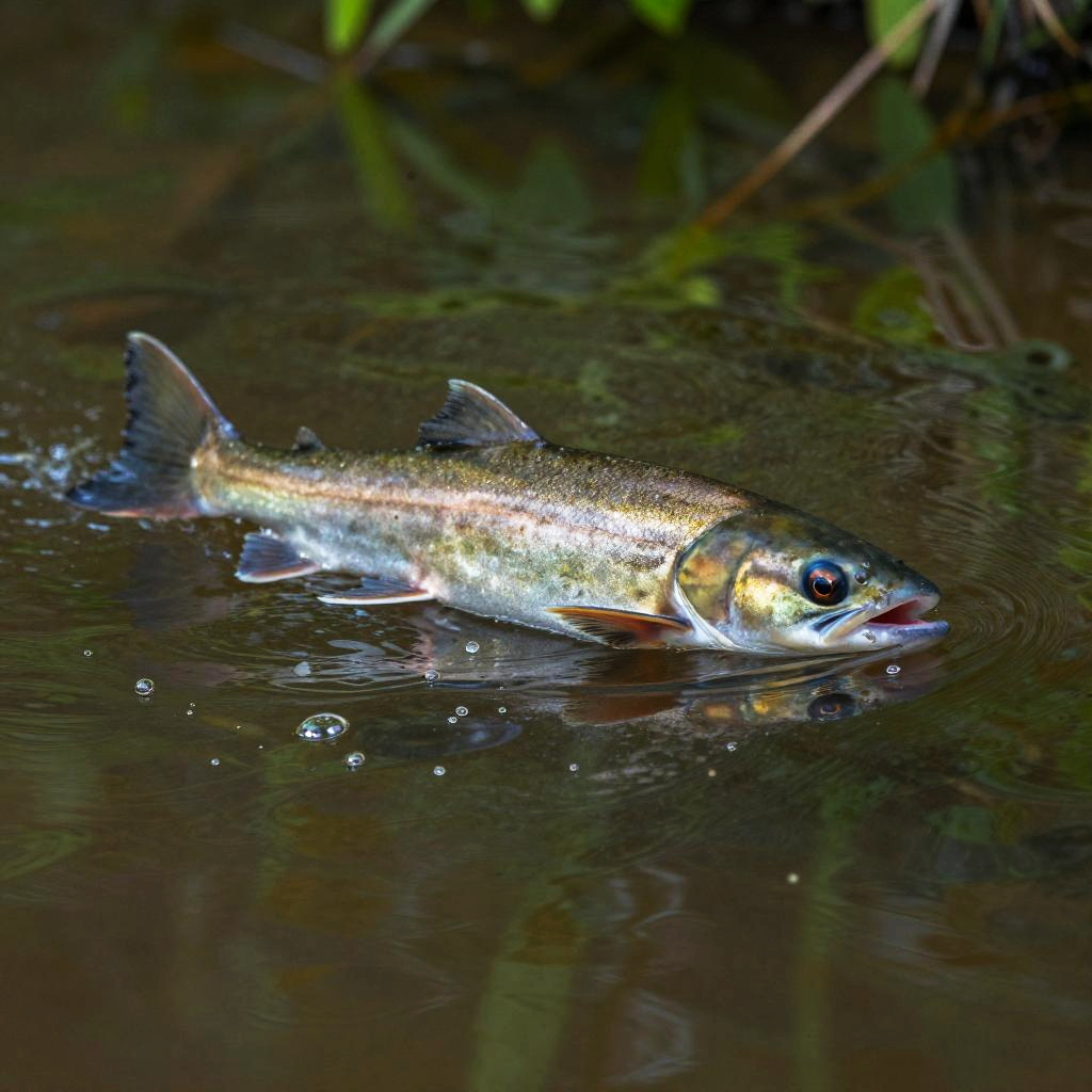 Hecht fish hunting in a lush green river environment, morning light creating reflections on water, realistic water ripples and bubbles, sharply detailed eyes and streamlined body, emphasizing agile movement and predator instincts in natural habitat.