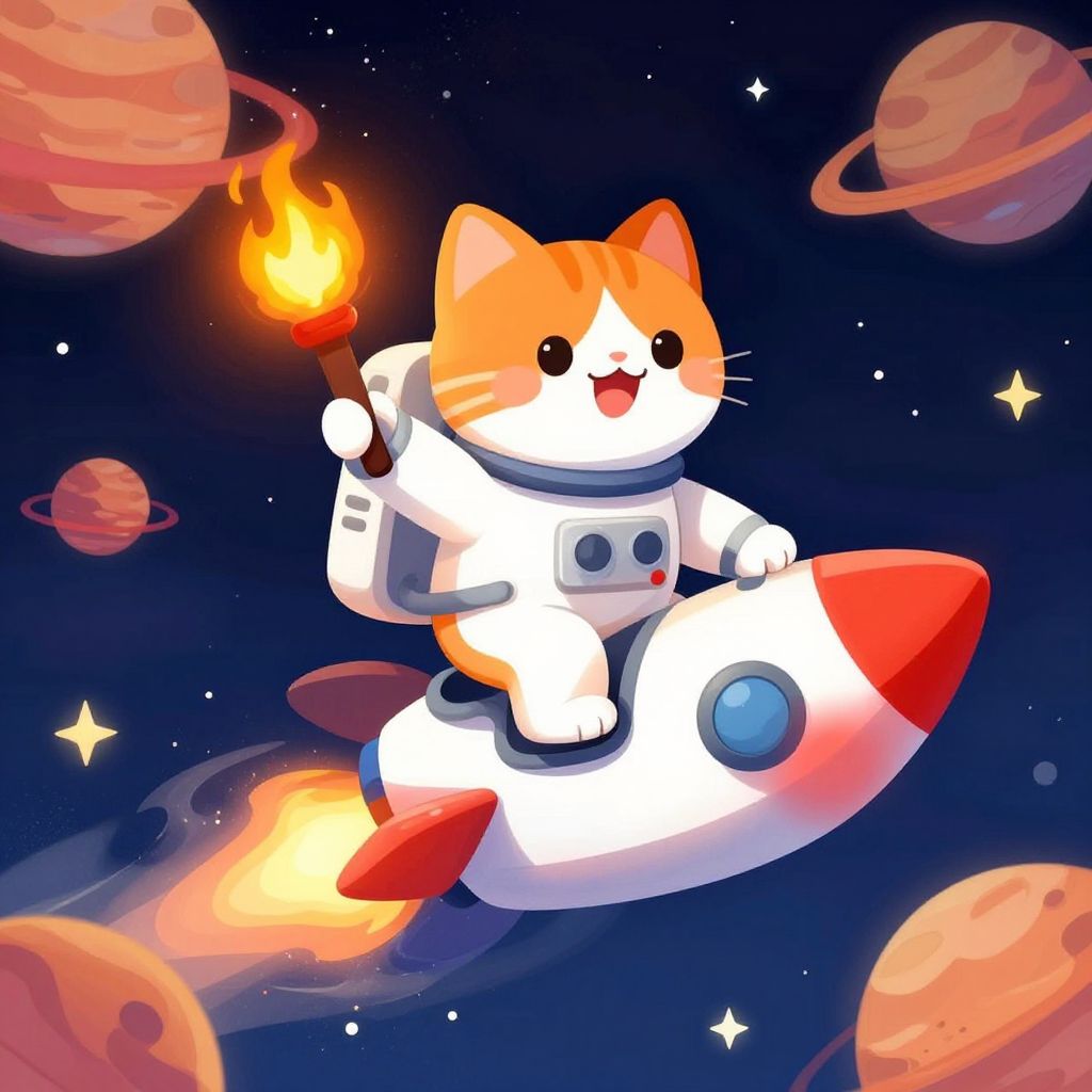 Digital illustration of an adorable, orange and white cat wearing a white astronaut suit with blue buttons, flying a red and white rocket ship through a starry night sky. The cat, with a joyful expression and wide eyes, holds a torch with a bright orange flame in its right paw. Surrounding the rocket are colorful planets with rings and craters, adding a whimsical, cosmic feel. The background is a deep blue, dotted with small white stars, enhancing the sense of space and adventure. The overall art style is vibrant and cartoonish, with bold colors and smooth, rounded shapes.