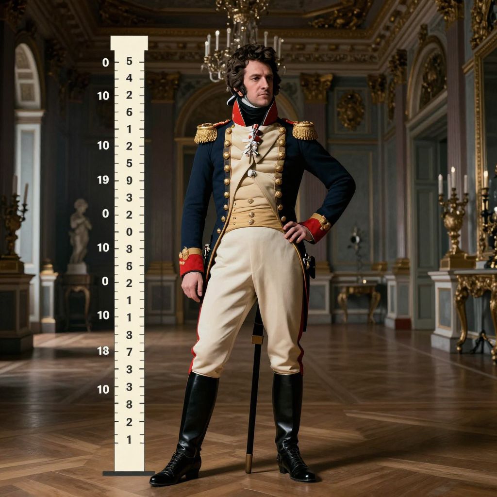 How tall Napoleon Bonaparte appeared in his prime, illustrated in a dramatic pose with a height comparison chart next to him, set in a grand French palace interior, intricate military garb, moody lighting emphasizing stature and authority.