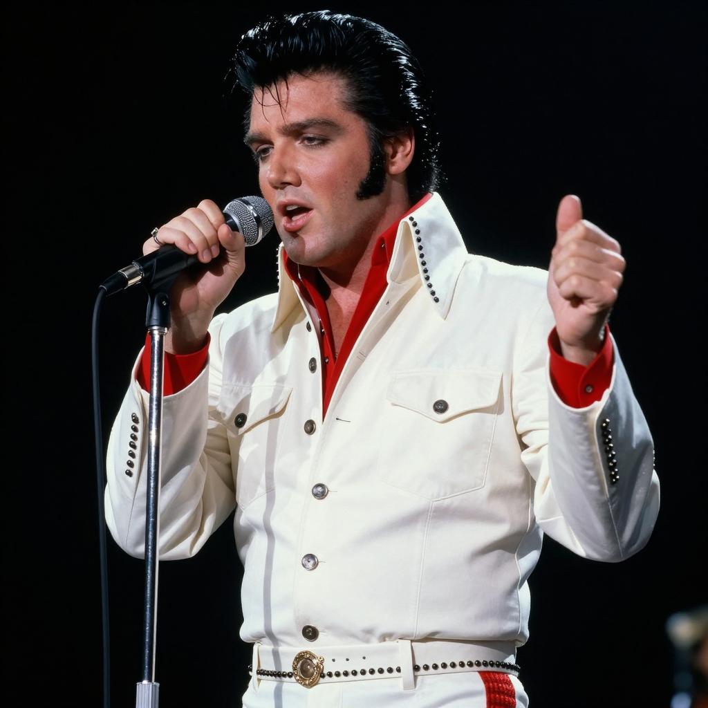 Elvis Presley singing into a microphone, wearing a white, button-up jacket with black bead trim, and a red shirt. Dark hair, side profile, right hand raised with thumb up. Microphone stand on left. Black background. Color photograph.