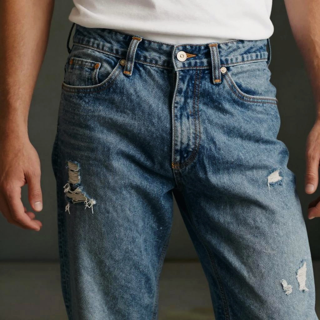Ryan Gosling jeans retro look, faded jeans with rolled cuffs, 70s inspired setting, warm tones, authentic casual vibe, candid street style, film grain effect
