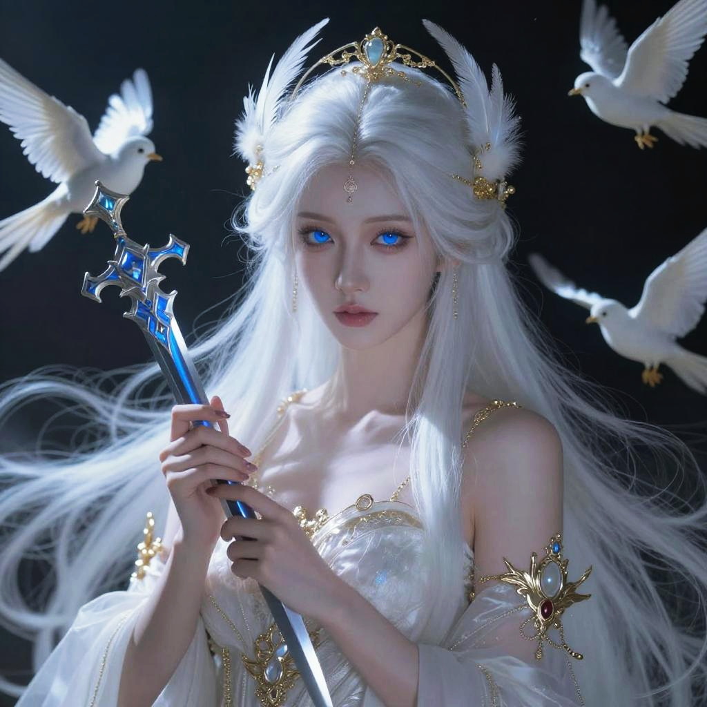 Digital art of a mystical, ethereal woman with pale skin and striking blue eyes. She has long, flowing white hair adorned with a golden headpiece and feathers. She's holding a delicate, ornate blue and silver dagger, with birds swirling around her. Her expression is serene and slightly mysterious. The background is dark and gradient, highlighting her luminous features. The art style is highly detailed and fantasy-inspired.