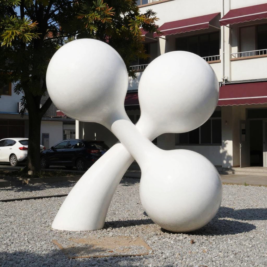 Photograph of a modern, white, abstract sculpture resembling a twisted, elongated figure with three large, spherical elements. It's positioned in a gravel courtyard with trees and parked cars in the background. The sculpture casts long shadows, and there's a multi-story building with red awnings behind it. The image has a slightly surreal, high-contrast feel.