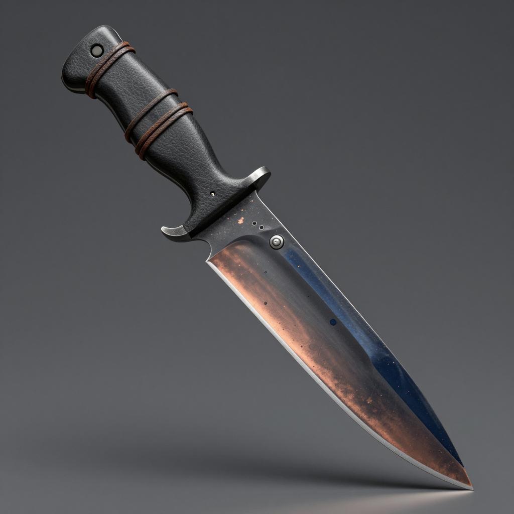 Modeling cs:go skin for knife with shades of dark blue and copper colour splashes on the blade, handle is black with a thin leather string wrapped around it 4 times, high detail, sharp edges, realistic, full view, cool texture,