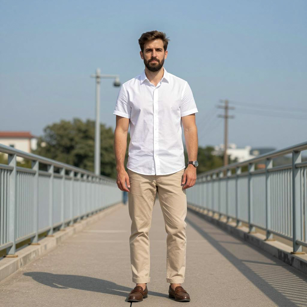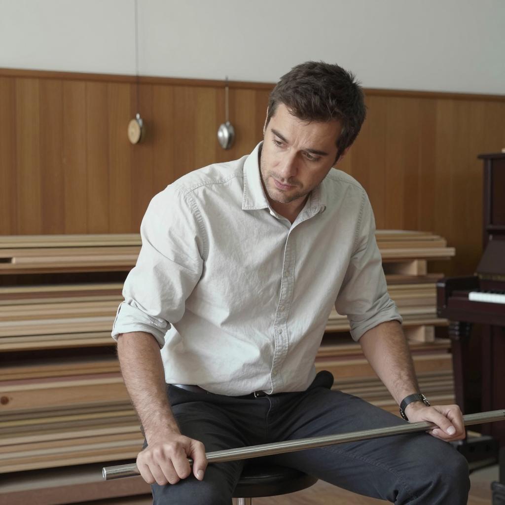 A man with short dark hair, wearing a light-colored, button-down shirt with sleeves rolled up, and dark trousers. He sits on a stool, holding a metal rod, leaning forward slightly. Behind him are stacked wooden planks and an upright piano. He has a focused expression. Two objects hang on the wall in the background. The setting is an indoor room with a wooden wall panel and a ured white ceiling. The man is positioned centrally, facing slightly to the right.