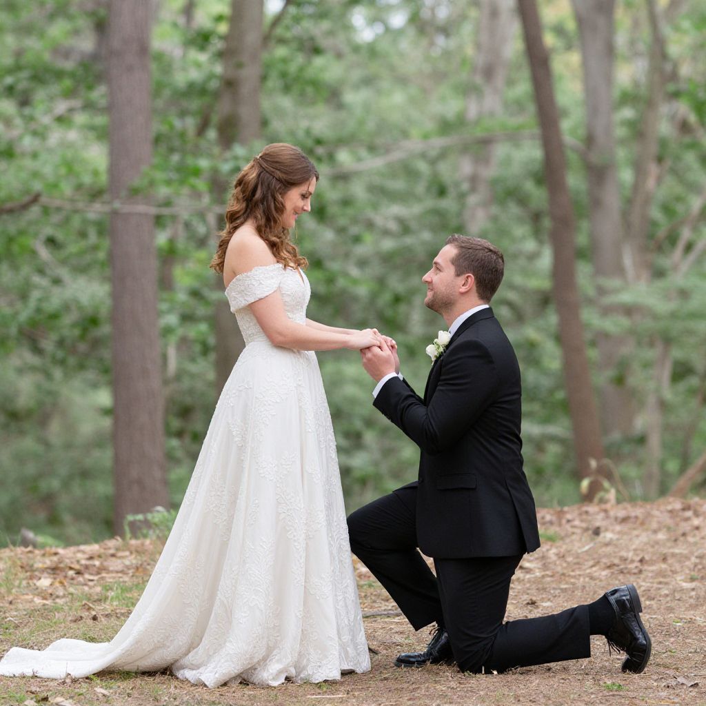 A romantic proposal captured in a serene wooded setting, featuring a man kneeling on one knee and holding hands with a woman in an elegant off-the-shoulder gown, bathed in soft, natural light that evokes a classic and timeless aesthetic reminiscent of St. Louis wedding photography by Courtney Smith.