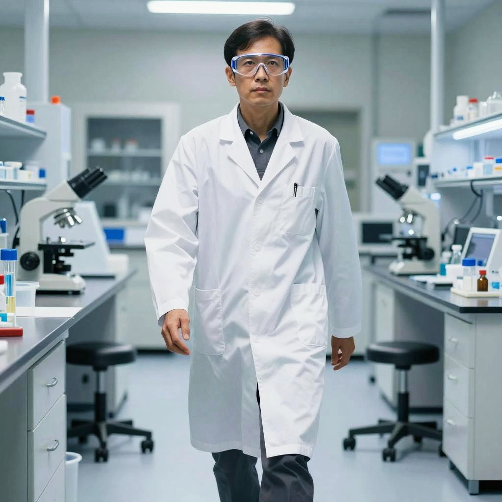 Realistic photo.a determined scientist, wearing a lab coat and safety goggles, walking through a state-of-the-art laboratory, expressing focused ambition, depicted in the reflective and minimalist style of Tadao Tsuge. realistic photo