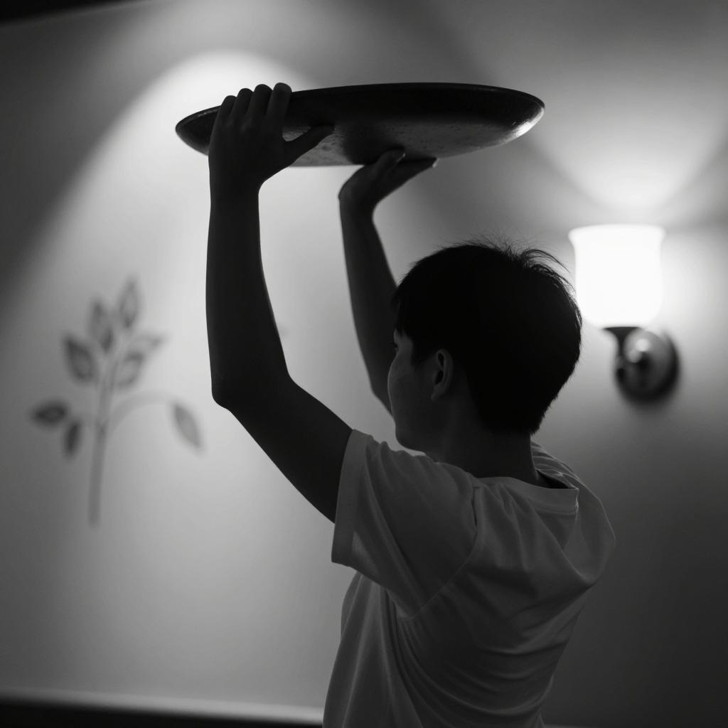 Black and white silhouette of a man with short hair wearing a plain t-shirt, raising his hand holding a hat-like object. The background features a softly lit wall with a modern wall sconce casting diffused light and subtle shadow patterns. The man's back is facing the camera in a minimal indoor setting.